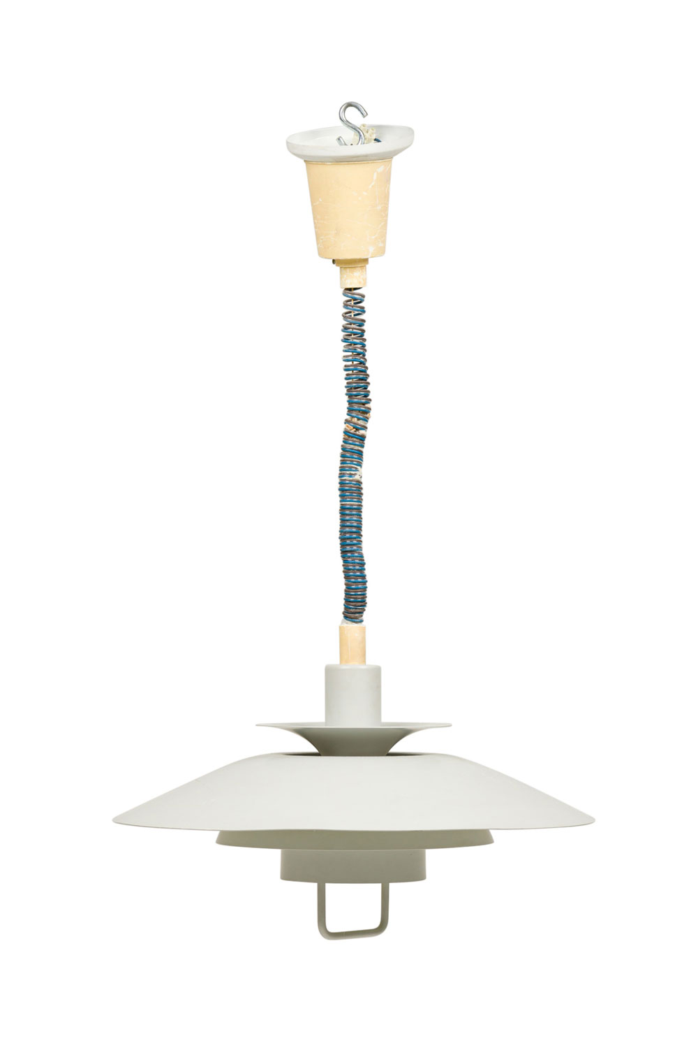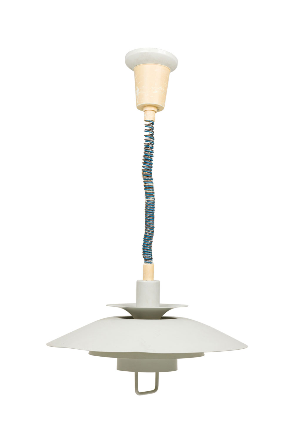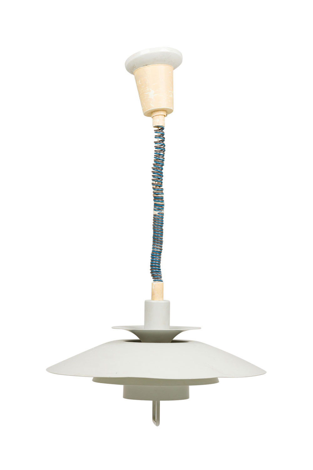 Scandinavian Mid-Century dove grey enameled aluminum round tierred pendant light fixture susupended by a coiled wire (POUL HENNINGSEN).