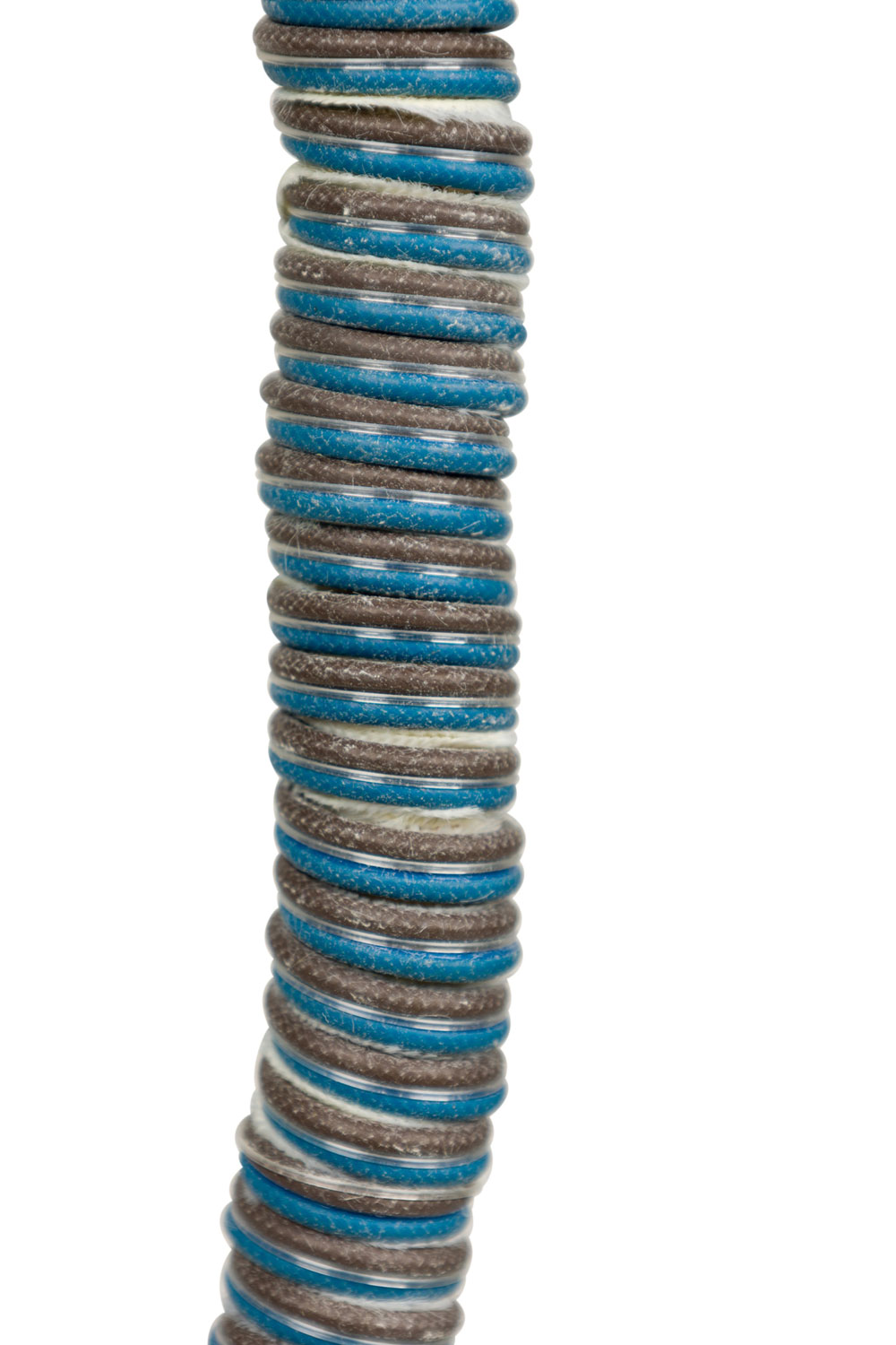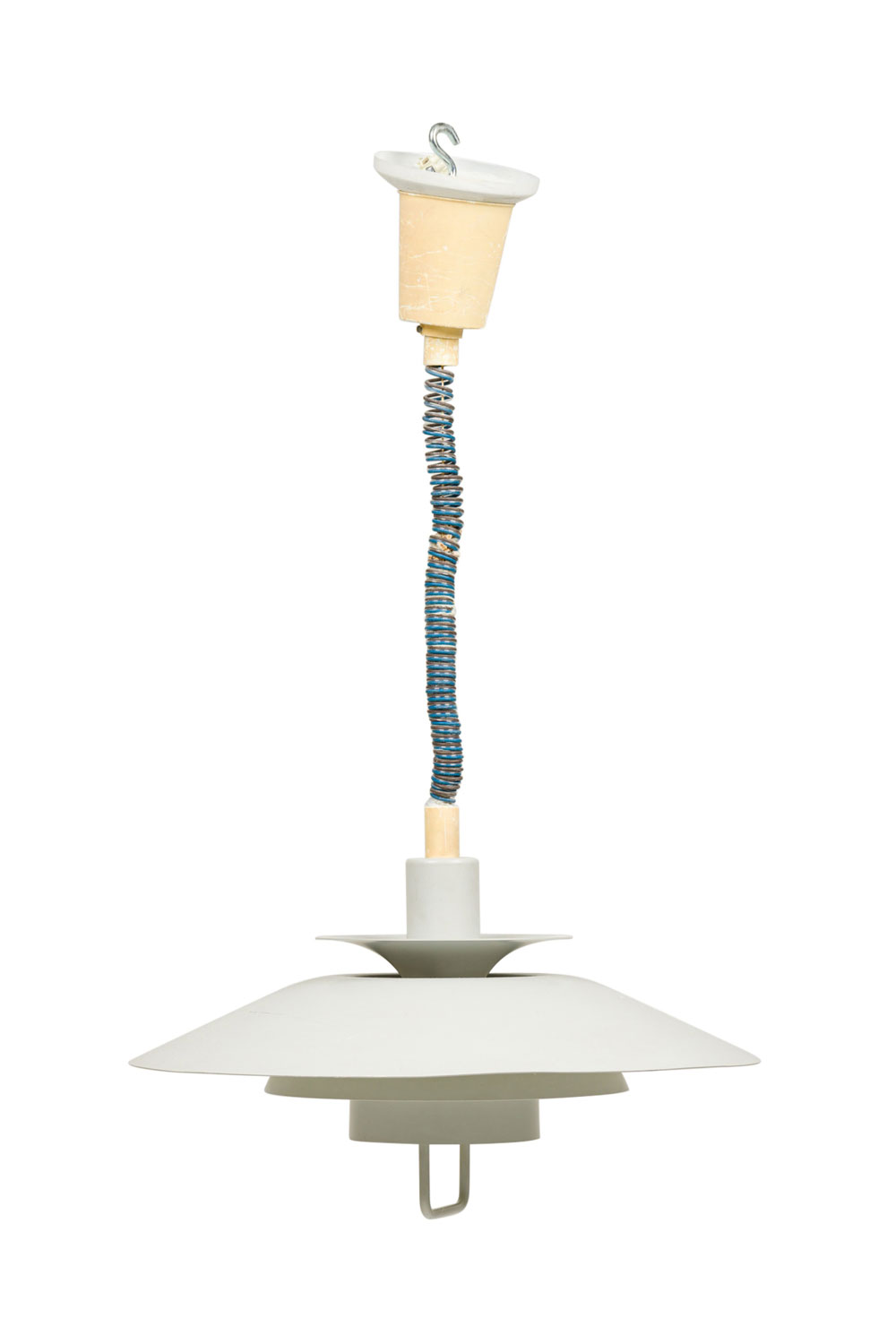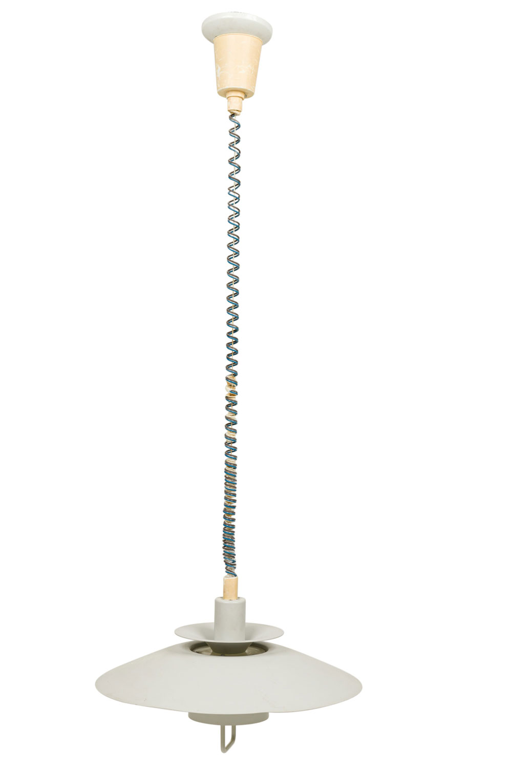 Scandinavian Mid-Century dove grey enameled aluminum round tierred pendant light fixture susupended by a coiled wire (POUL HENNINGSEN).