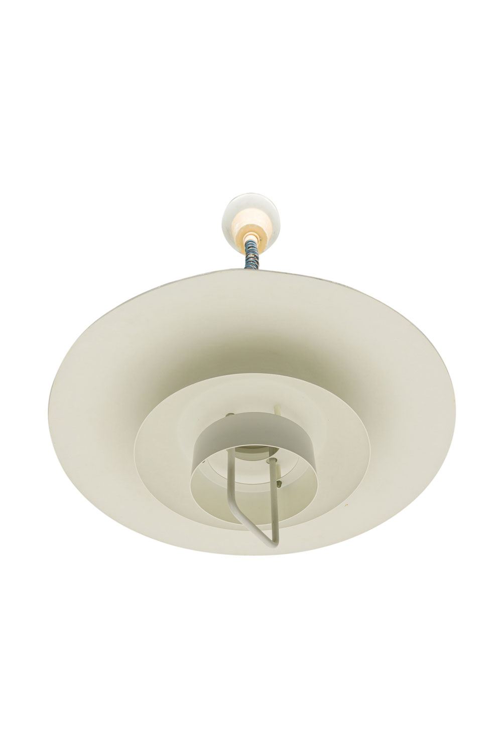 Scandinavian Mid-Century dove grey enameled aluminum round tierred pendant light fixture susupended by a coiled wire (POUL HENNINGSEN)