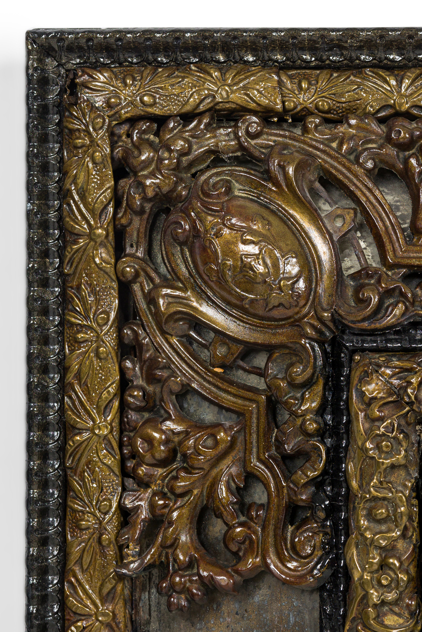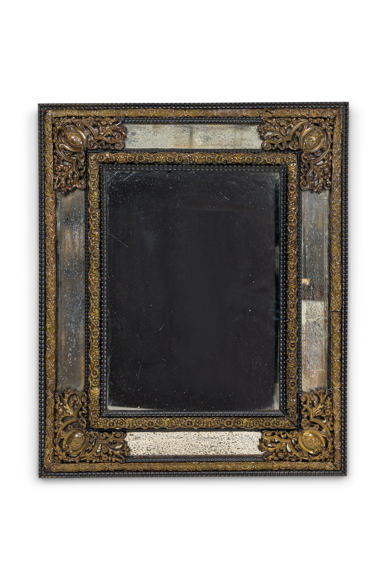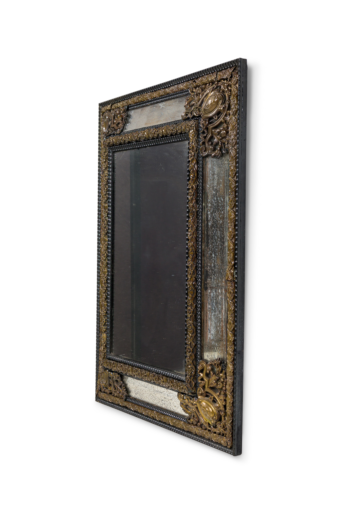 Dutch (18/19th Century) mirror with an ebonized carved wood and repoussé hammered brass frame having mirrored glass panel insets