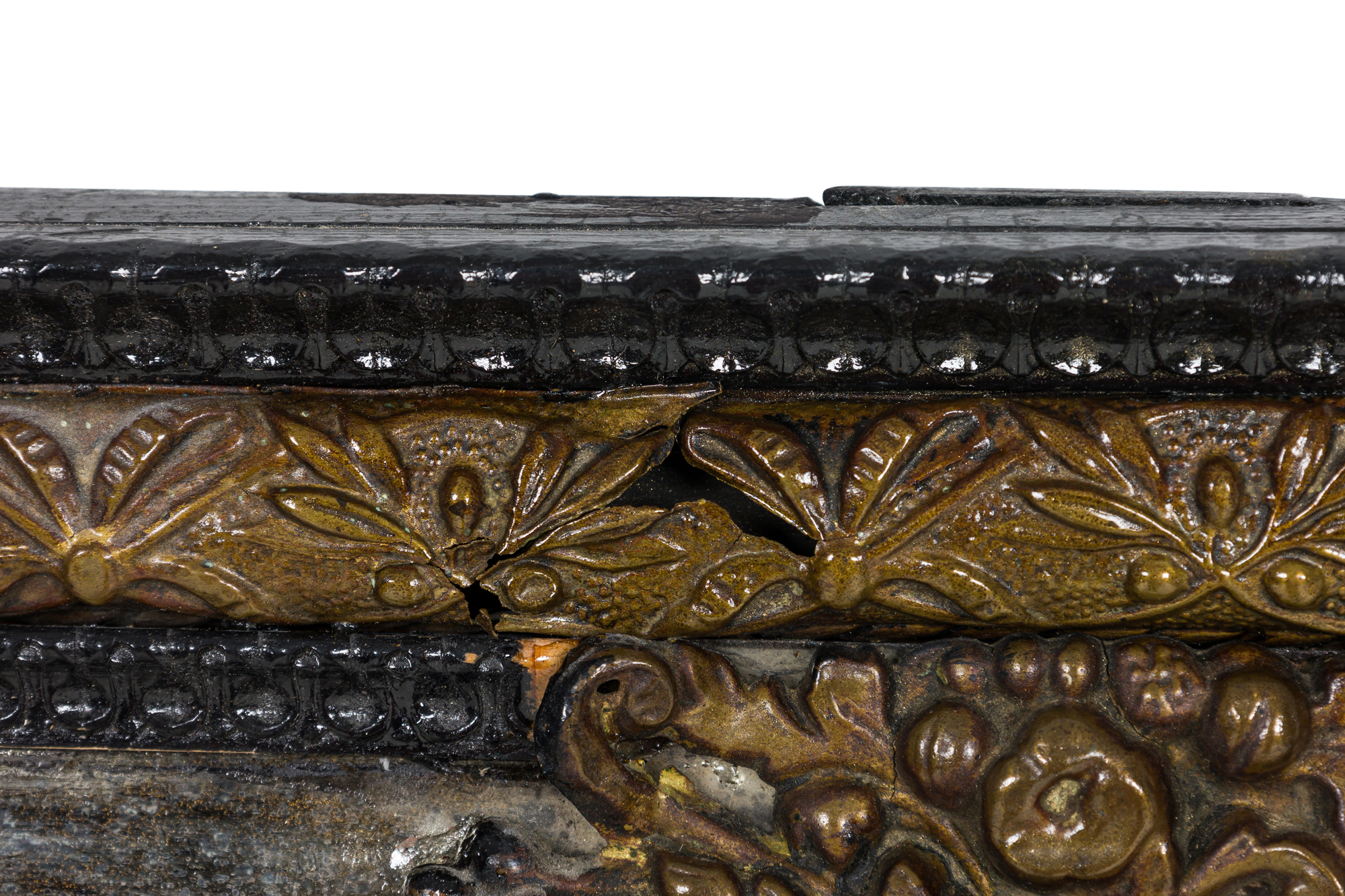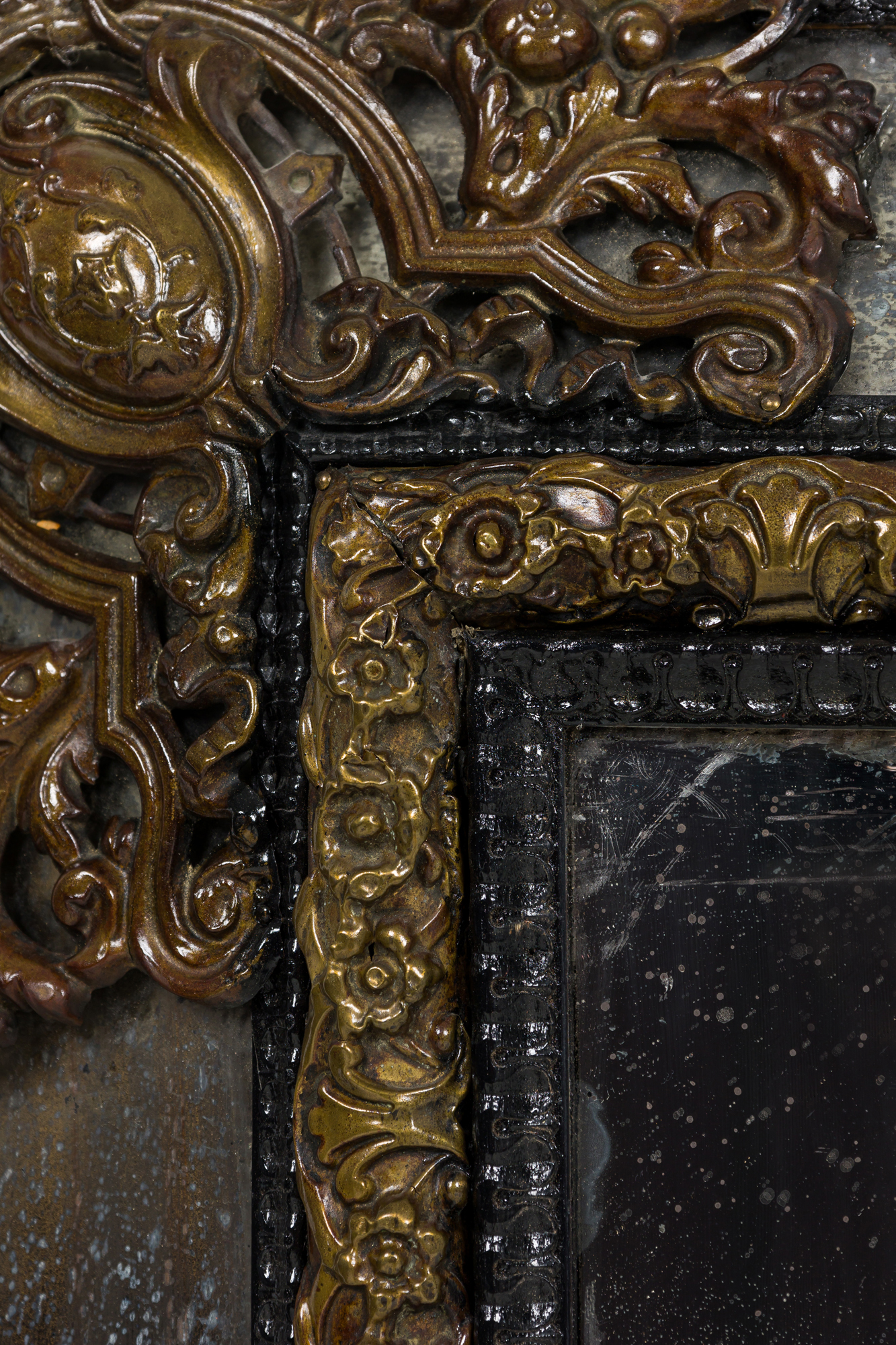 Dutch (18/19th Century) mirror with an ebonized carved wood and repoussé hammered brass frame having mirrored glass panel insets.