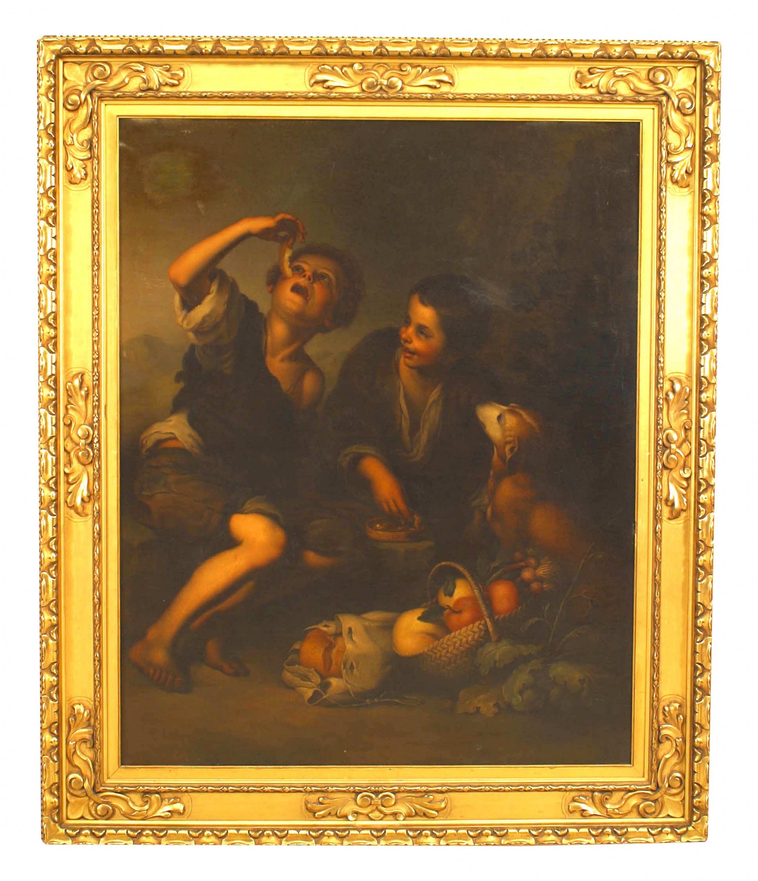 Italian Renaissance style (19th Cent) oil painting of 2 boys and dog with basket of fruit in a gold carved frame (AFTER Bartolome Esteban Murillo)