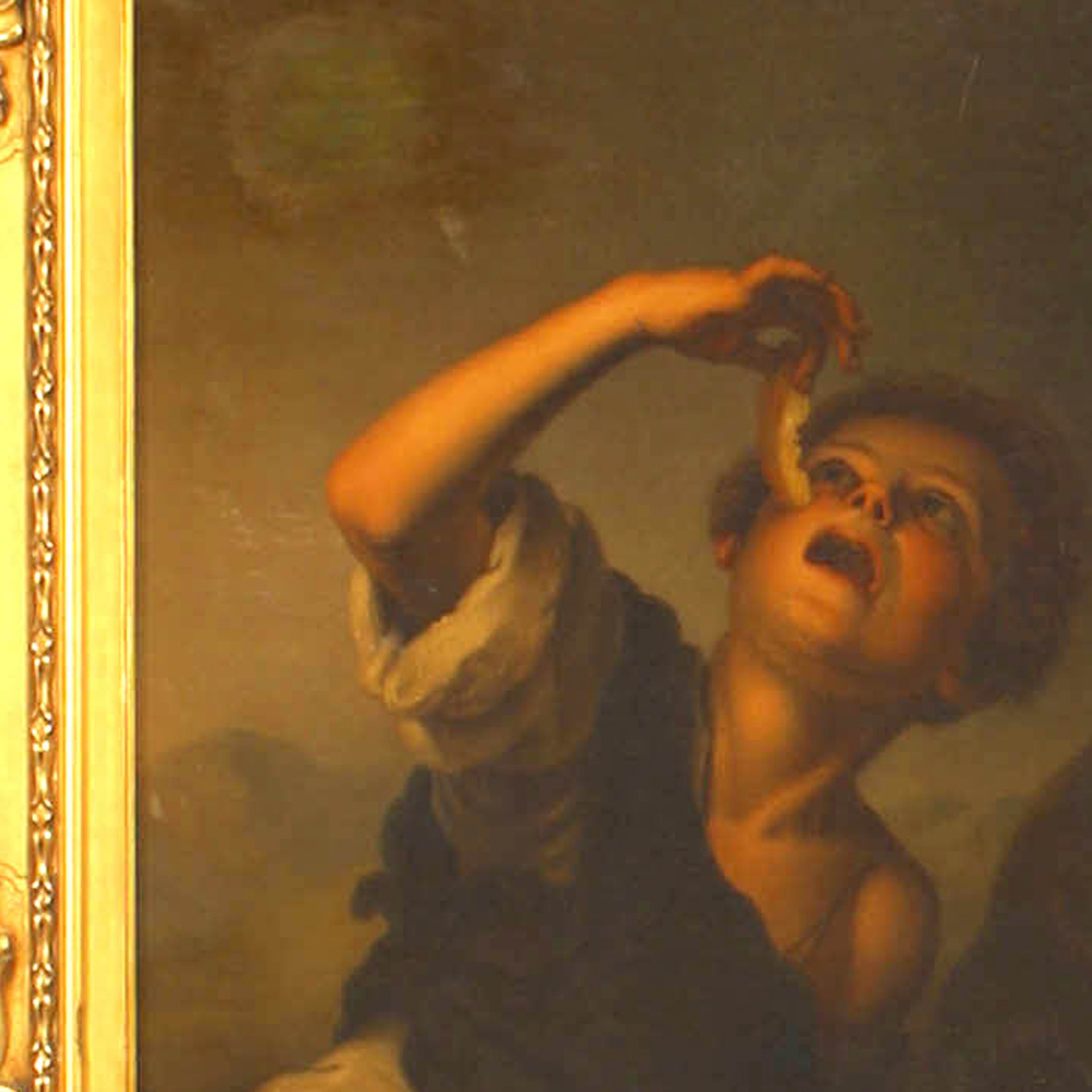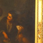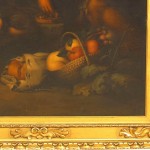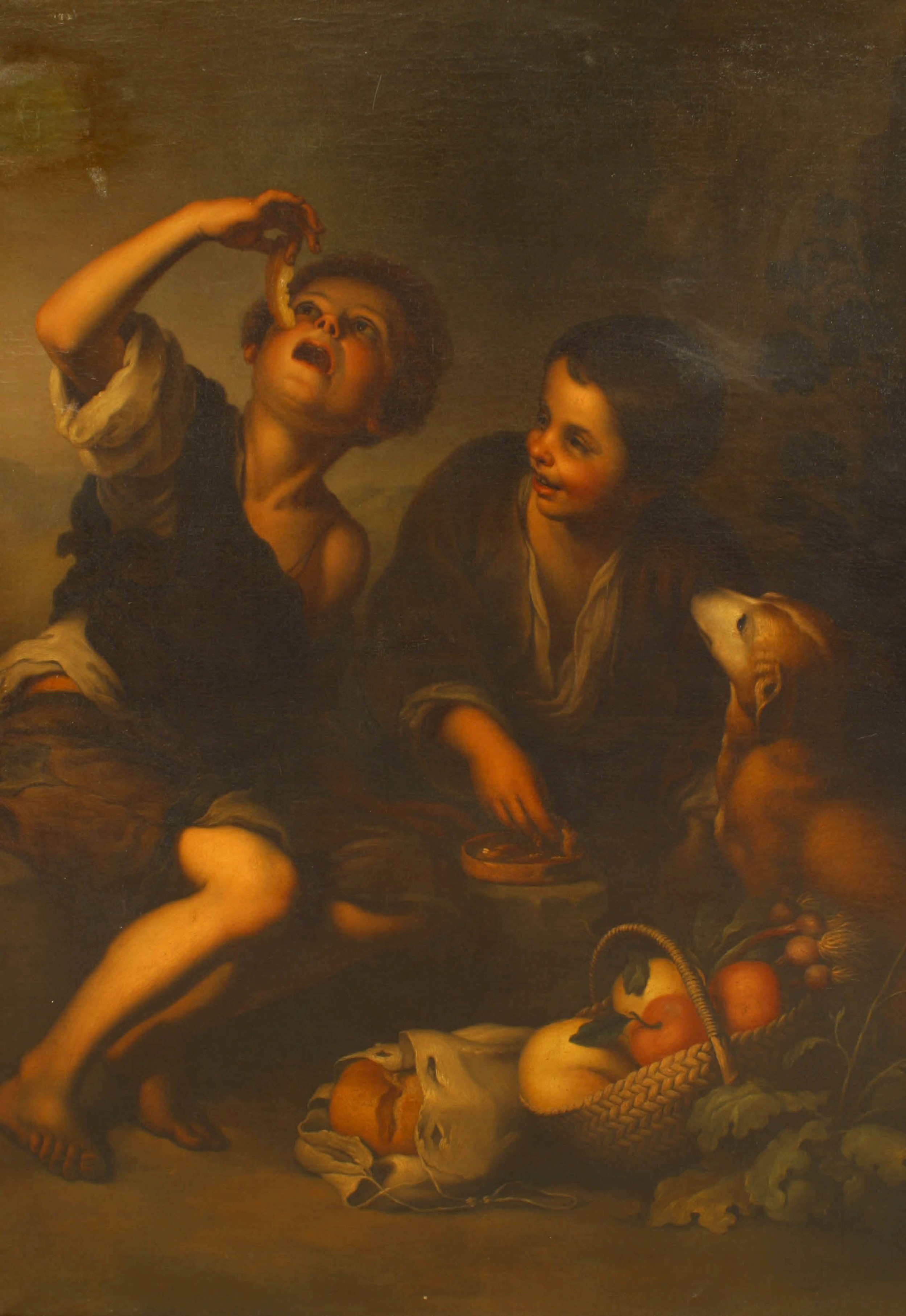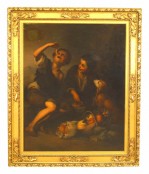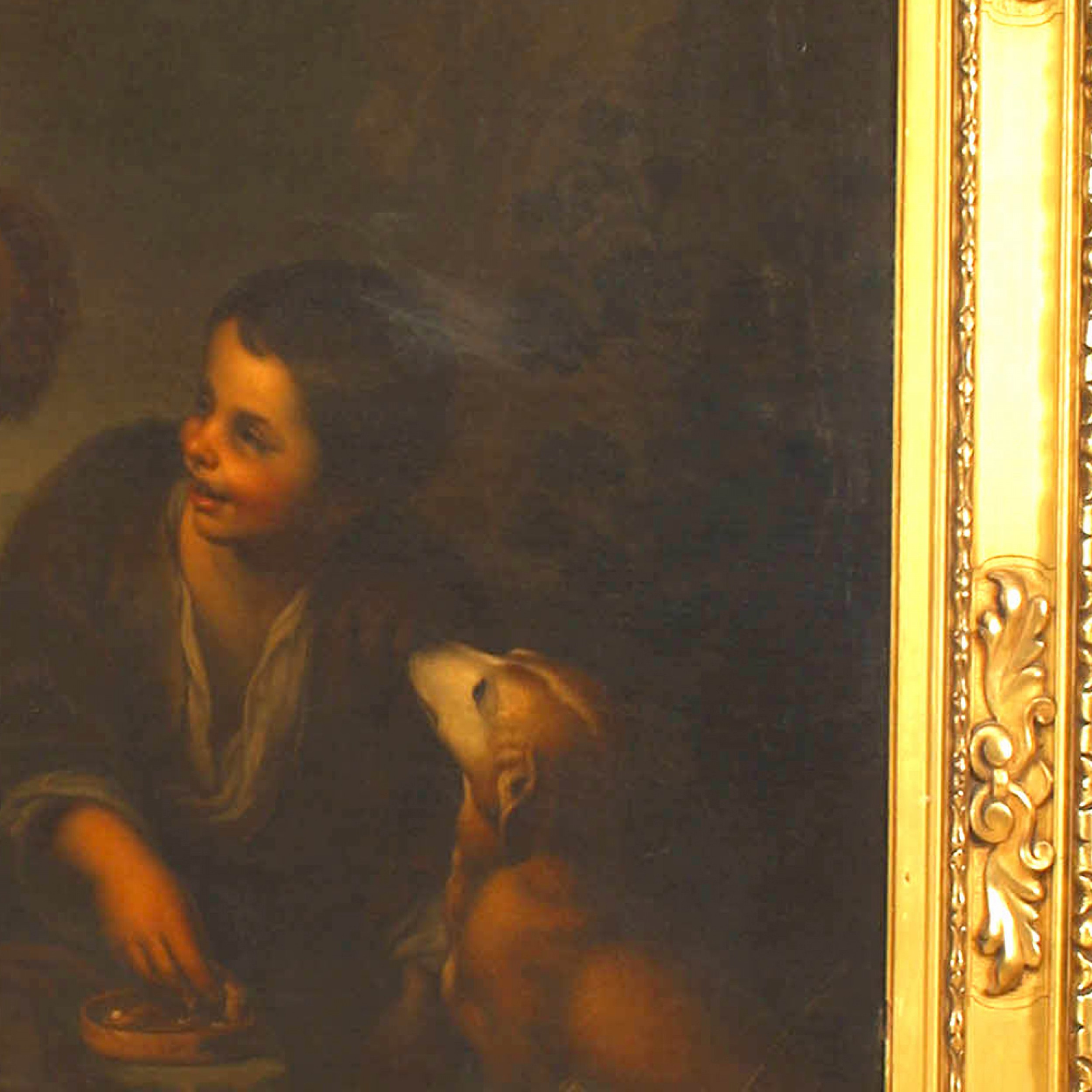 Italian Renaissance style (19th Cent) oil painting of 2 boys and dog with basket of fruit in a gold carved frame (AFTER Bartolome Esteban Murillo).