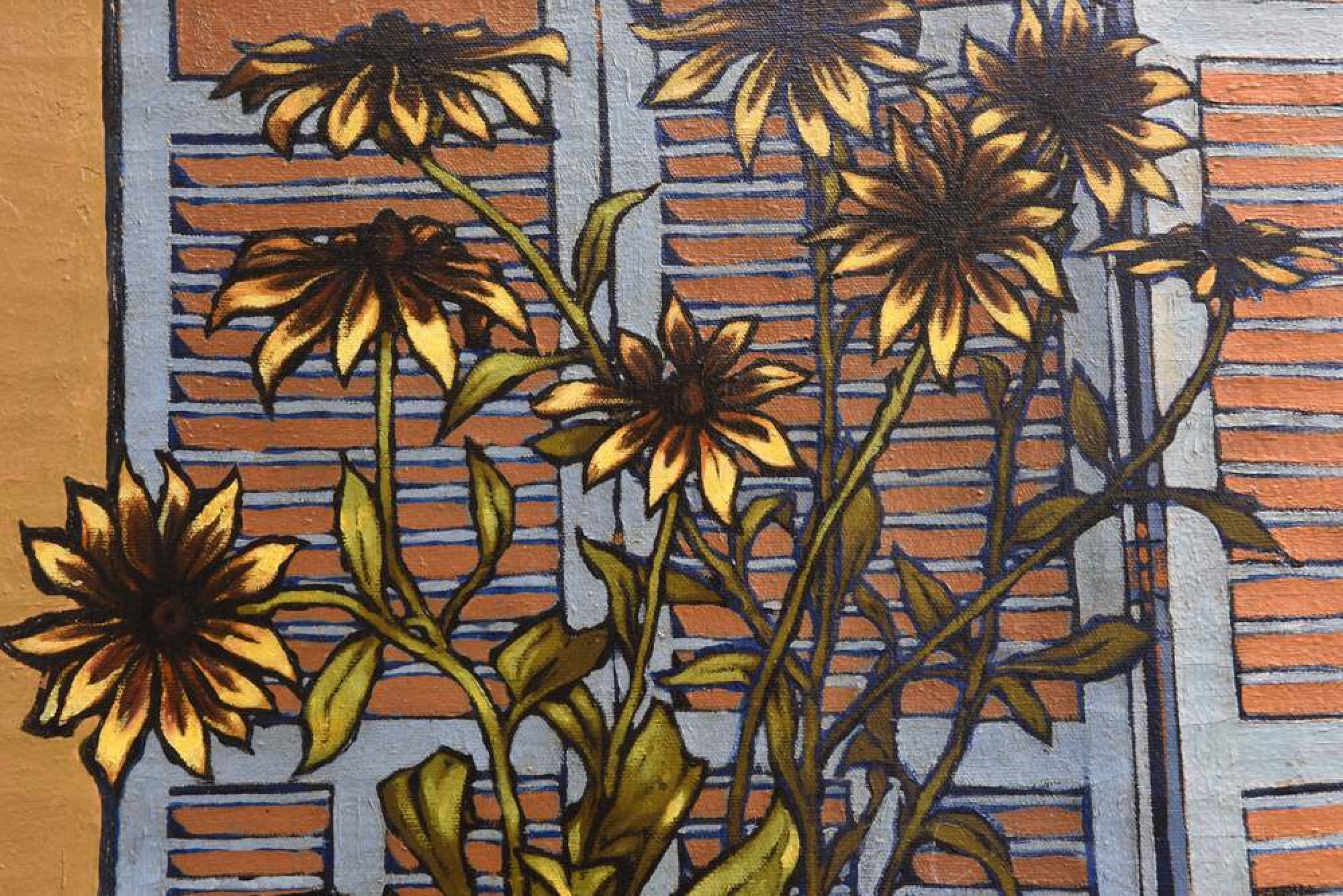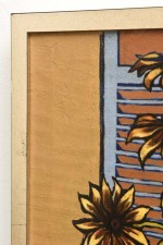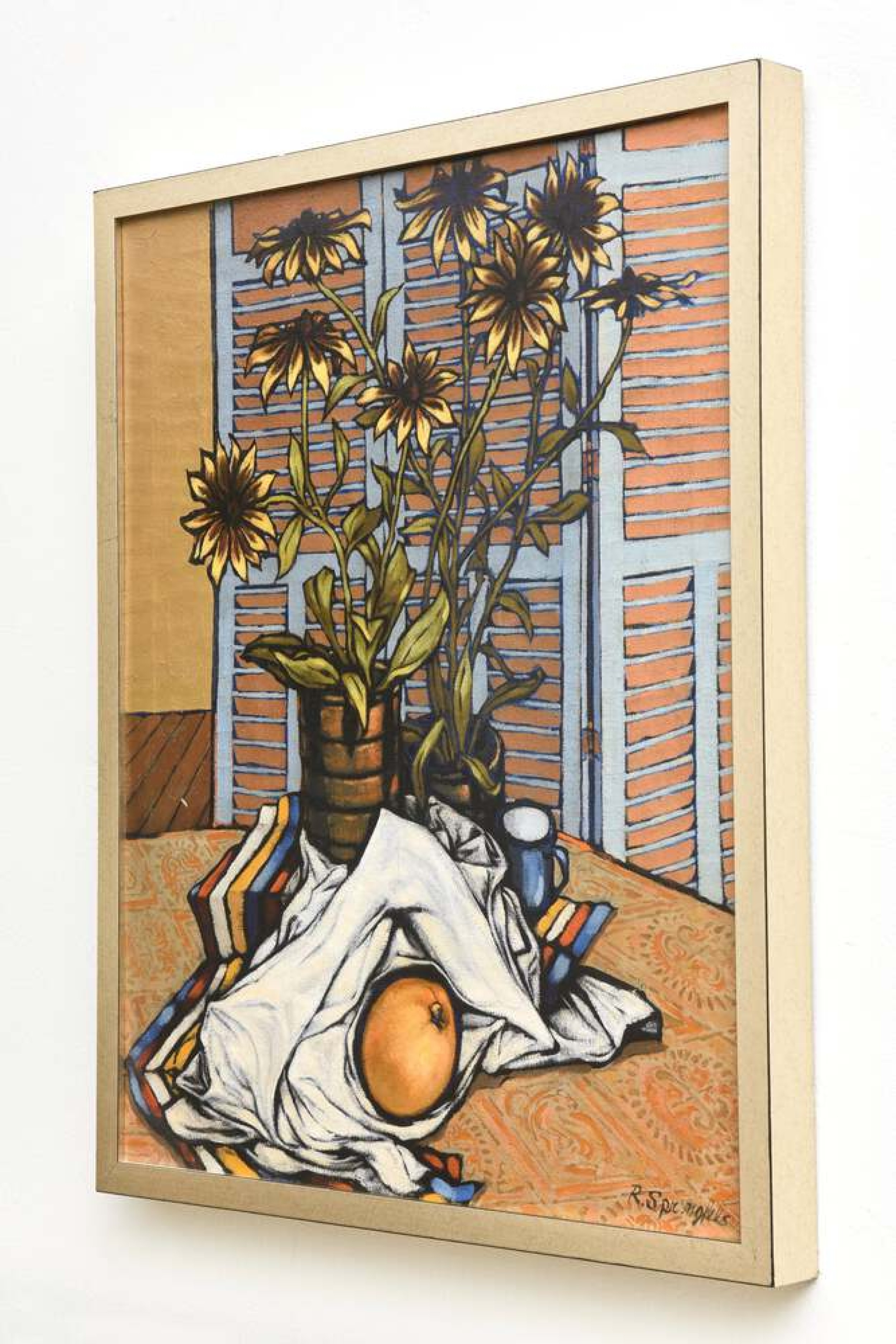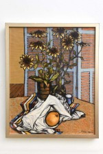 American Mid-Century surrealist oil on canvas depicting a orange in a white sheet resting on a table with a bouquet of sunflowers (ROBERT SPRINGFELS)
