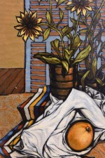 American Mid-Century surrealist oil on canvas depicting a orange in a white sheet resting on a table with a bouquet of sunflowers (ROBERT SPRINGFELS).