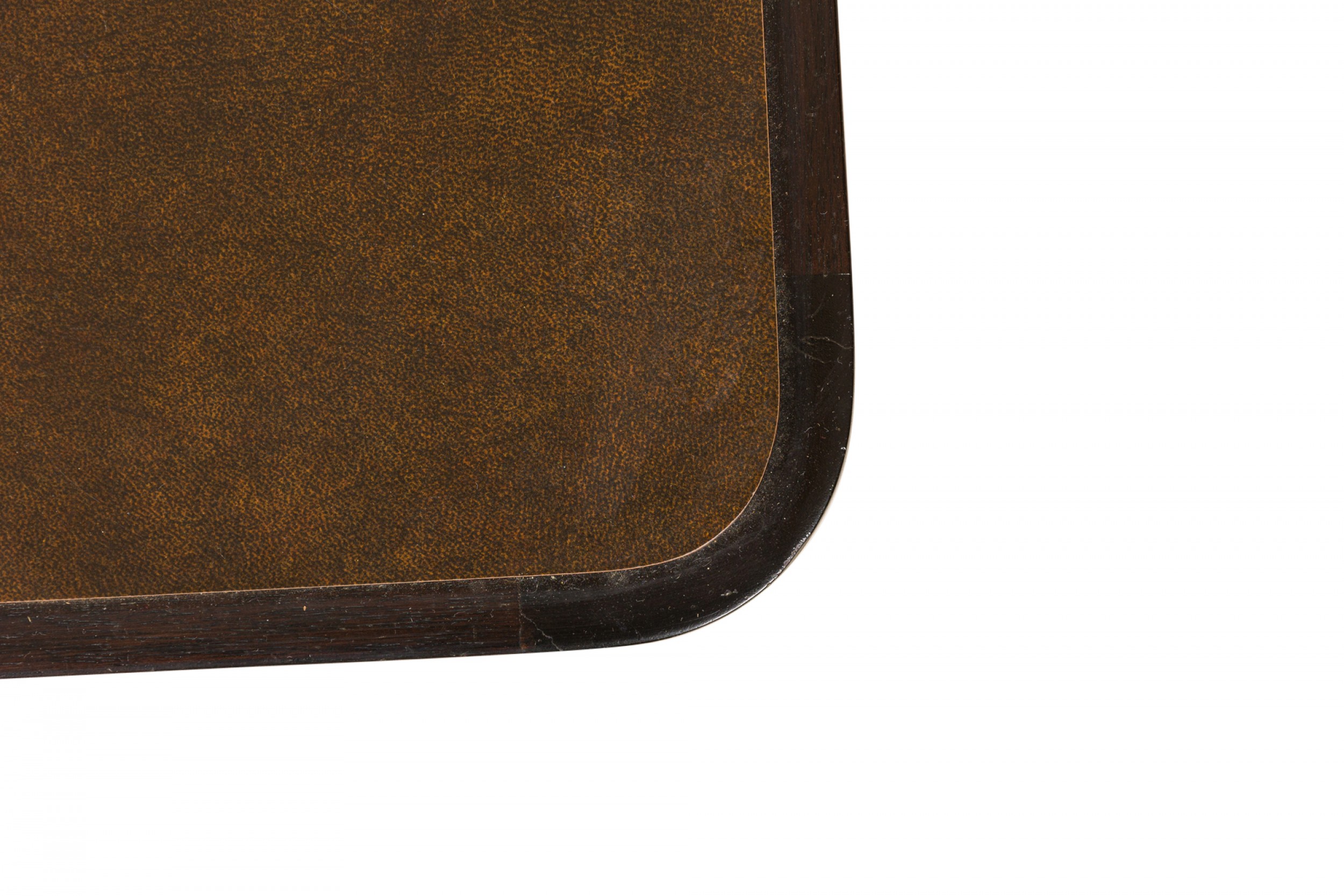 American Mid-Century 'Radius' form rectangular end / side table with a dark stained wooden frame, a slightly lighter raised wooden tabletop with rounded edges, and a middle stretcher shelf, resting on a solid base that creates and additional lower open compartment. (ROGER SPRUNGER FOR DUNBAR)(Similar table: DUF0655)
