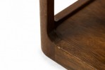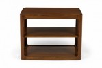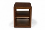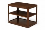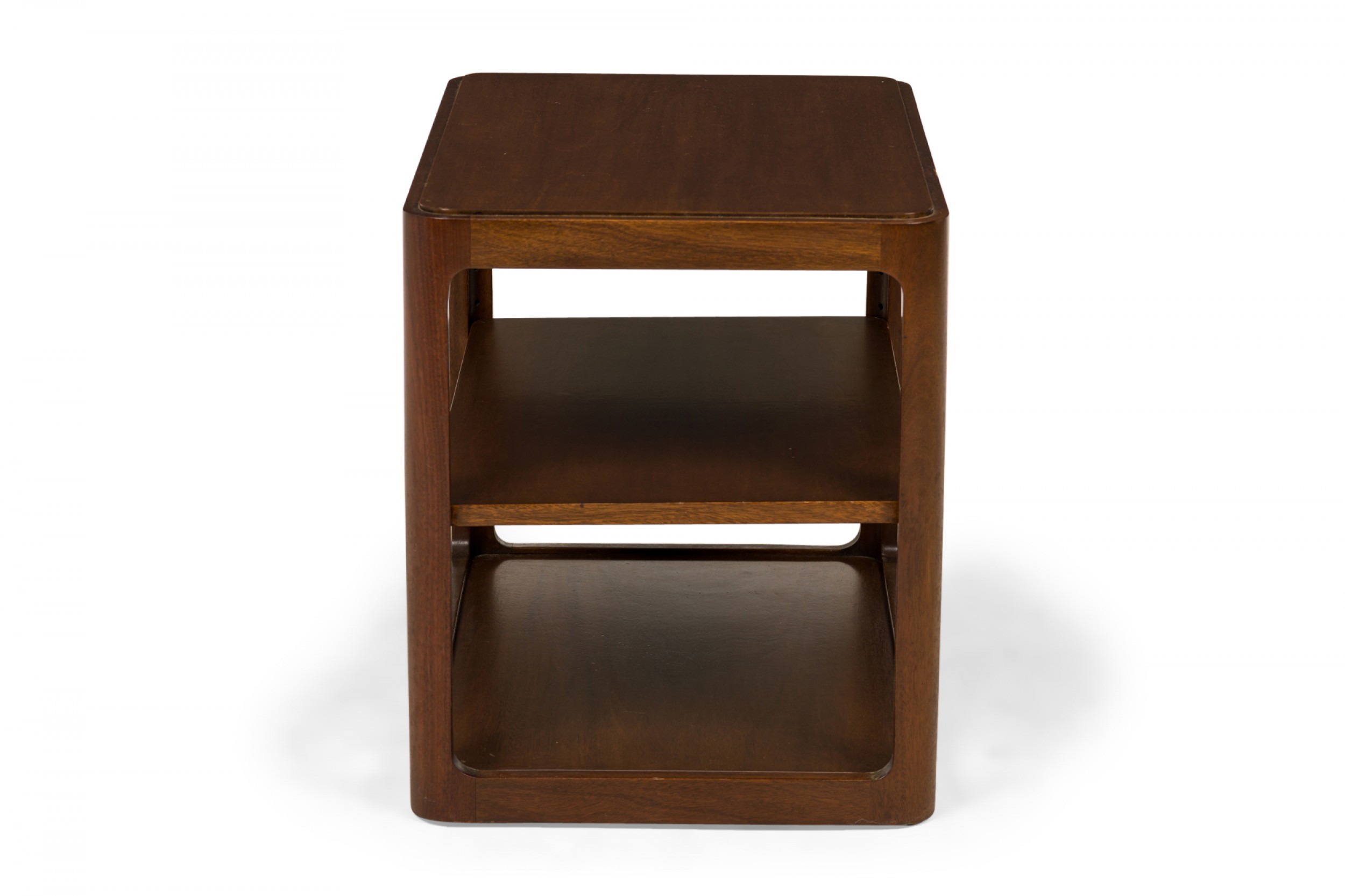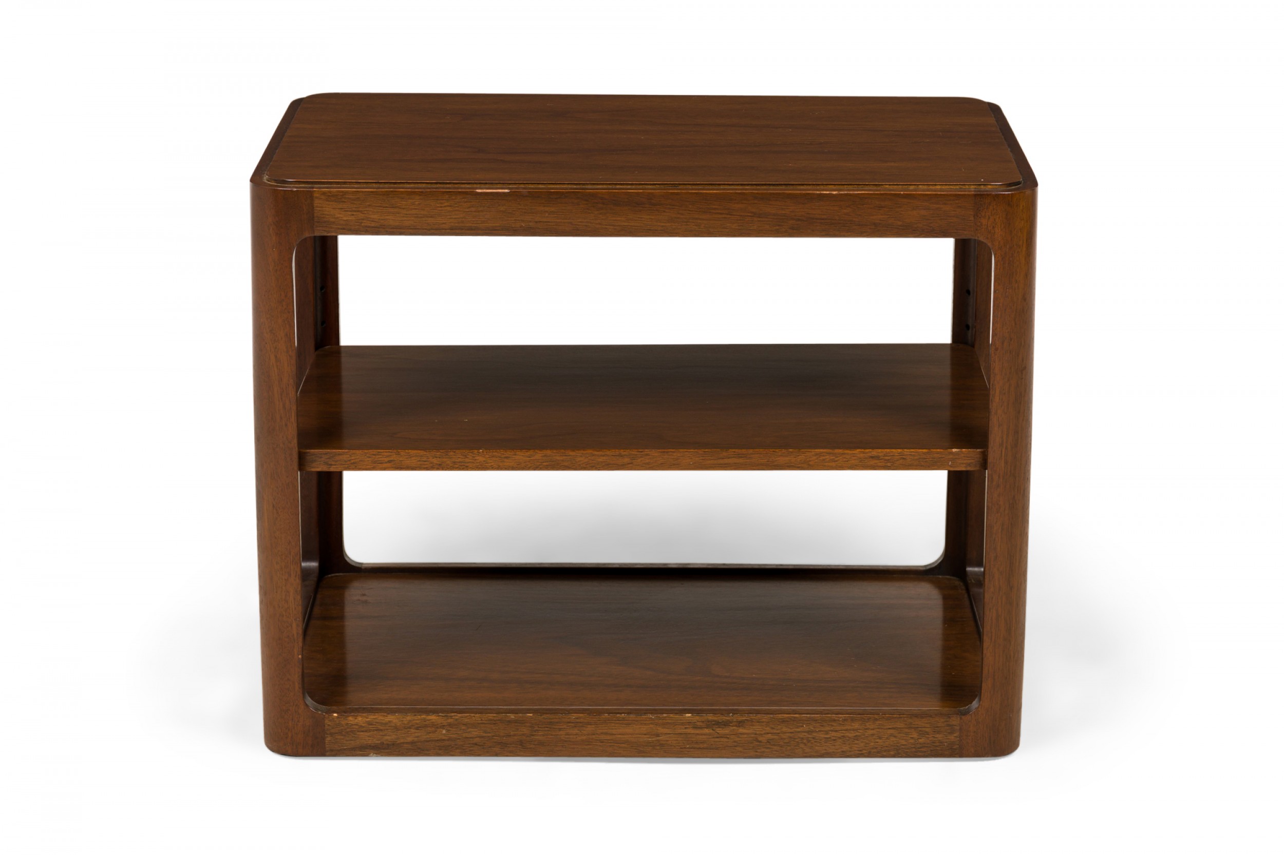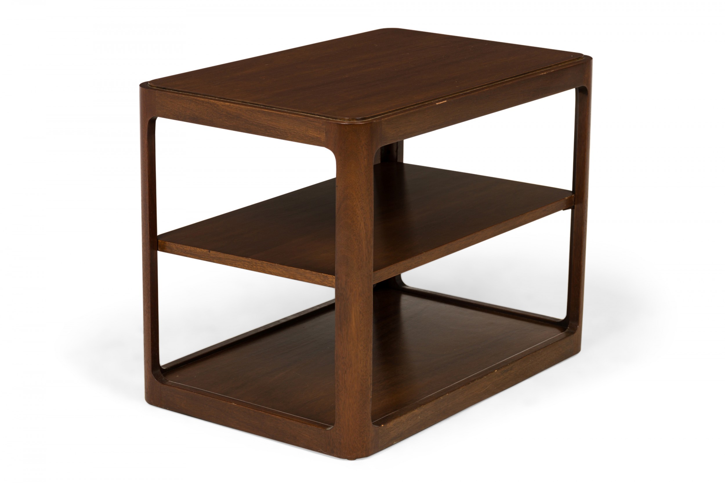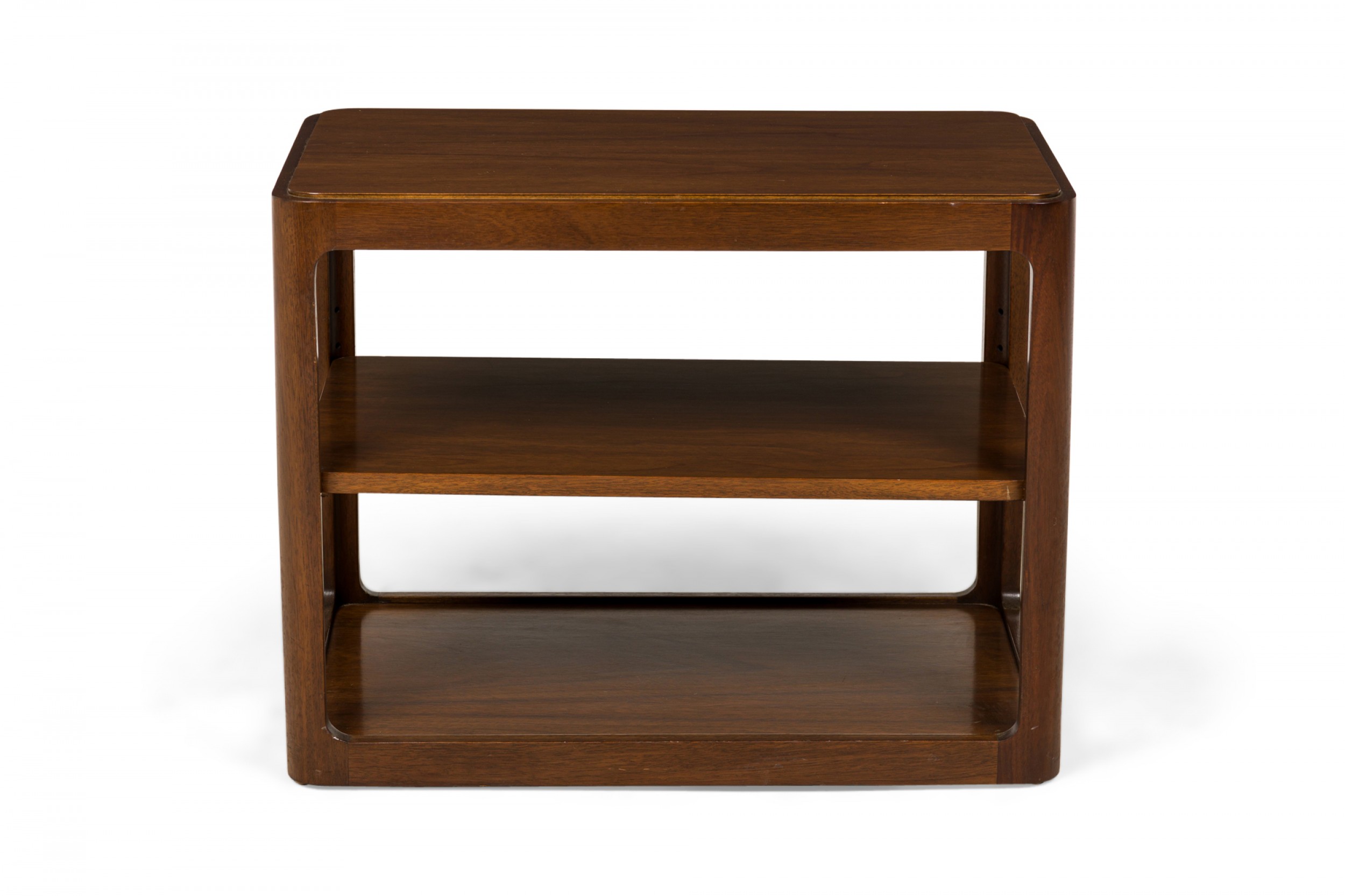 American Mid-Century 'Radius' form rectangular end / side table with a wooden frame, a slightly lighter raised wooden tabletop with rounded edges, and a middle stretcher shelf, resting on a solid base that creates and additional lower open compartment. (ROGER SPRUNGER FOR DUNBAR)(Similar table: DUF0656).