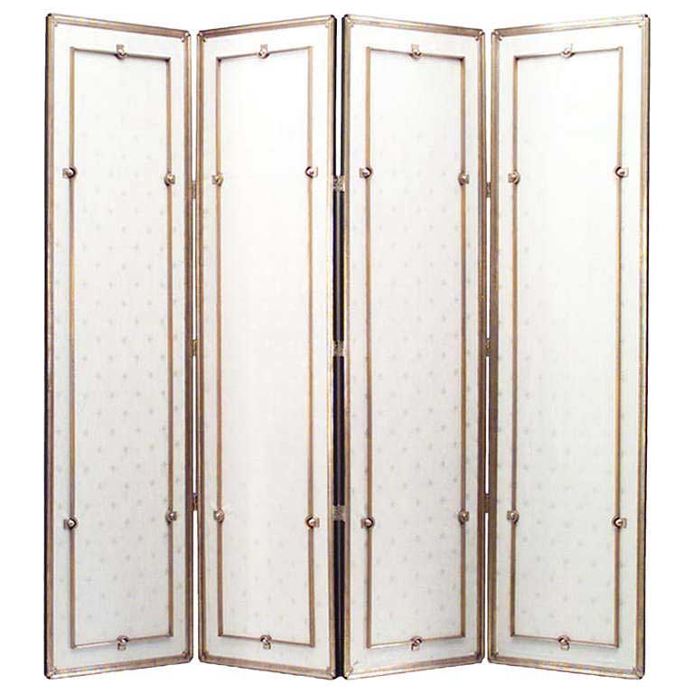 French 1940s 4 fold gilt wood framed screen with a gilt bronze inset frame over a white moire with a star design. (attributed to LUCIEN ROLLIN).