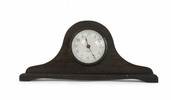 Round yellow wood clock with a white face, a black rim and black numbers, leaning on a black handle