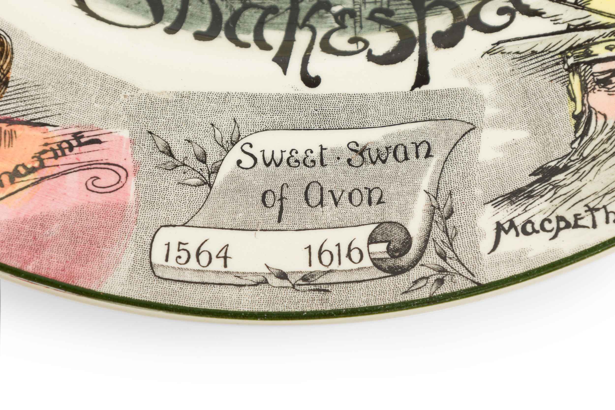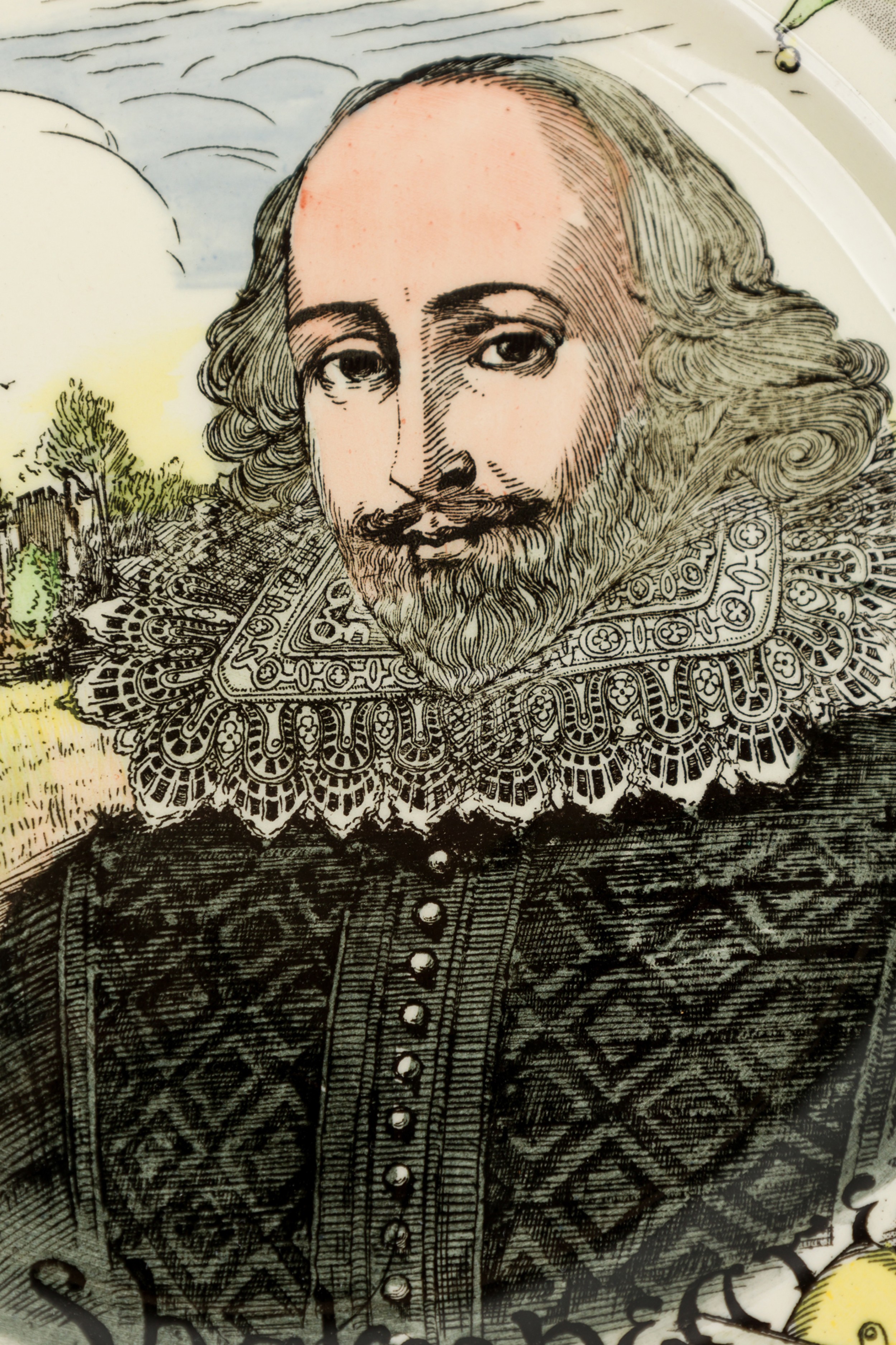 English Mid-Century commemorative display plate with Shakespeare in the center surrounded by his most famous characters (ROYAL DOULTON "6303").