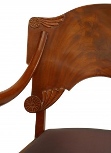PAIR of Russian (1st ½ 19th Cent) mahogany Armchairs with upholstered seat & carved foliate & rosettes on corner of back with sabre form front legs (Matching 6 SIDE CHAIRS: REG0922)