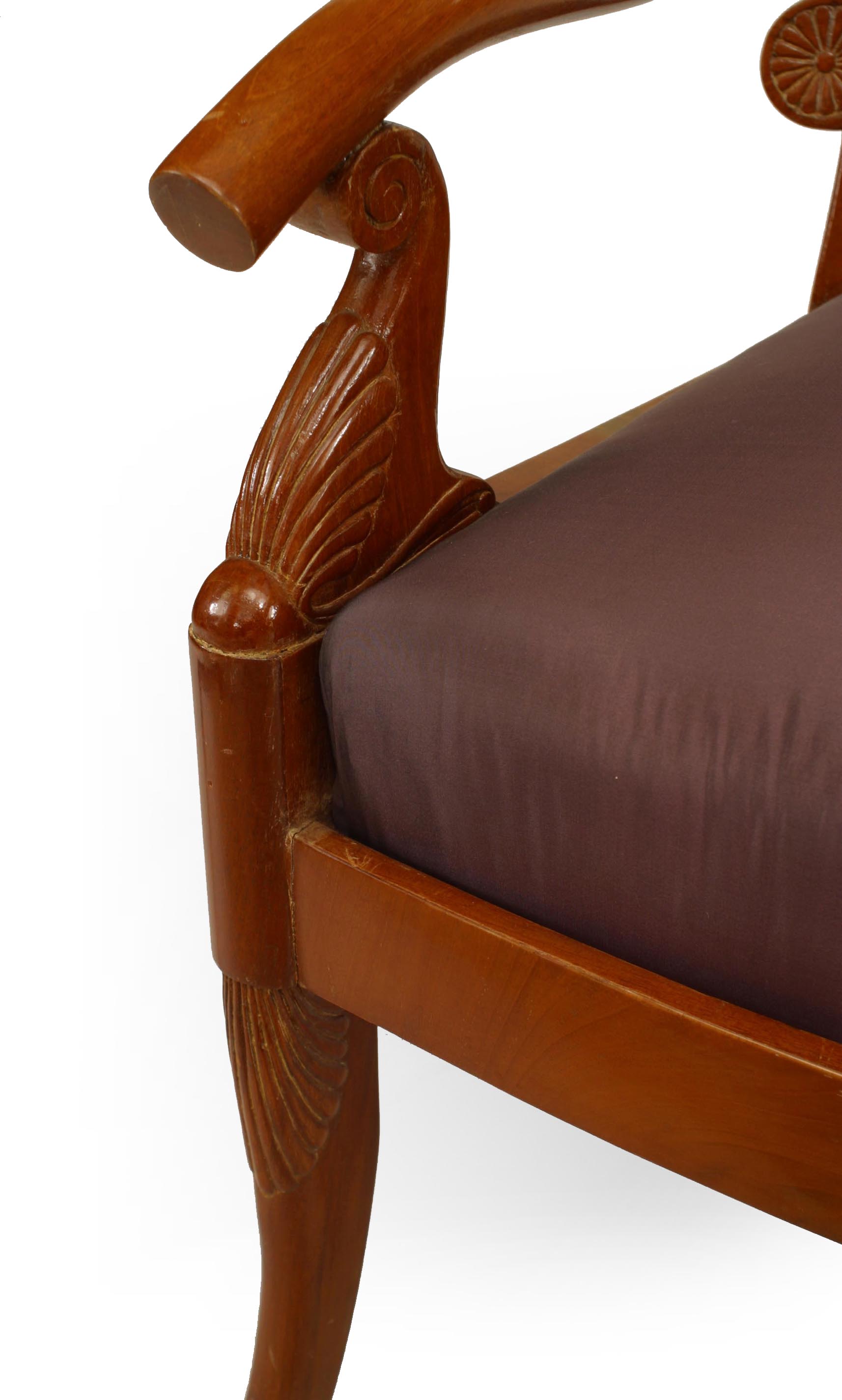 PAIR of Russian (1st ½ 19th Cent) mahogany Armchairs with upholstered seat & carved foliate & rosettes on corner of back with sabre form front legs (Matching 6 SIDE CHAIRS: REG0922).
