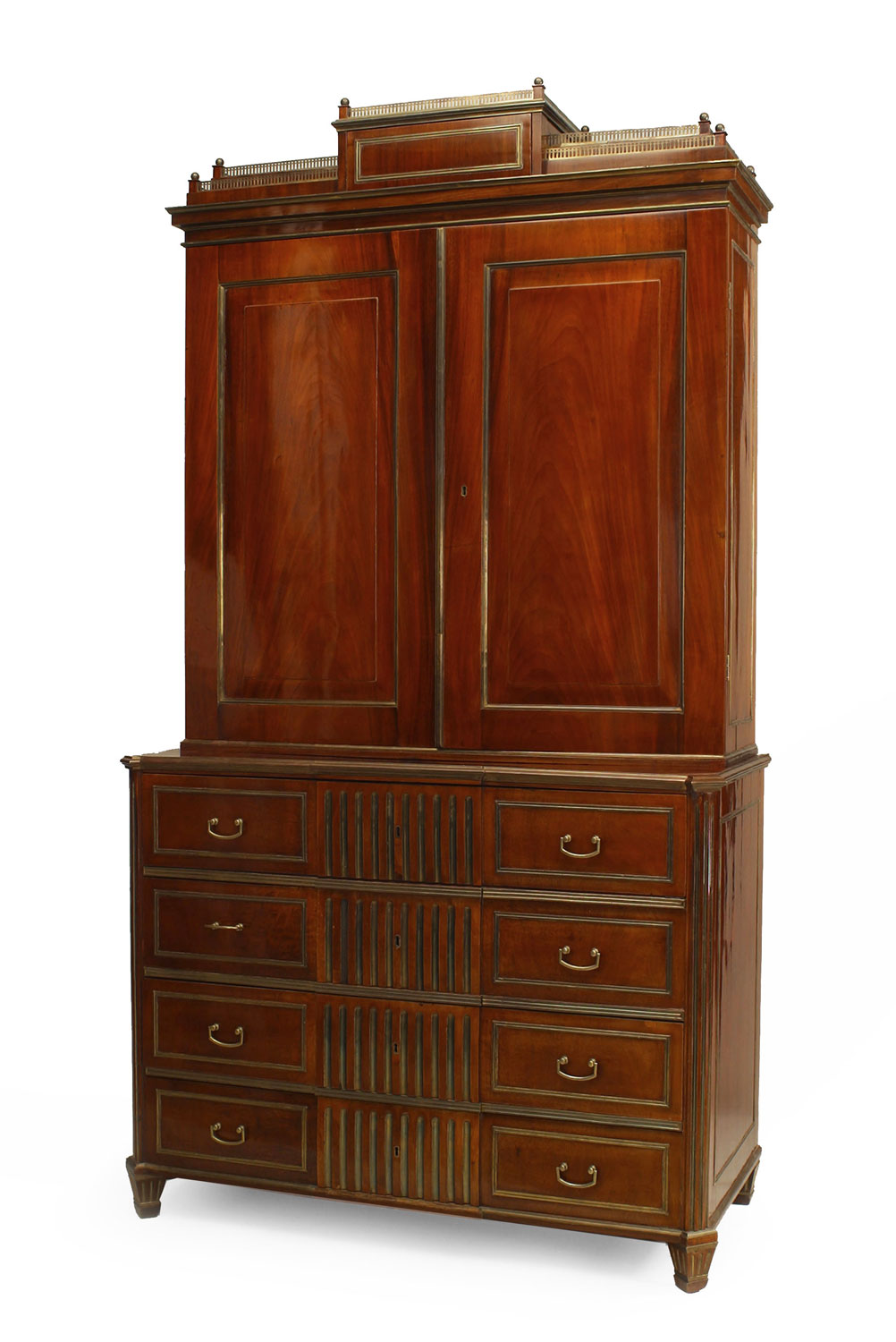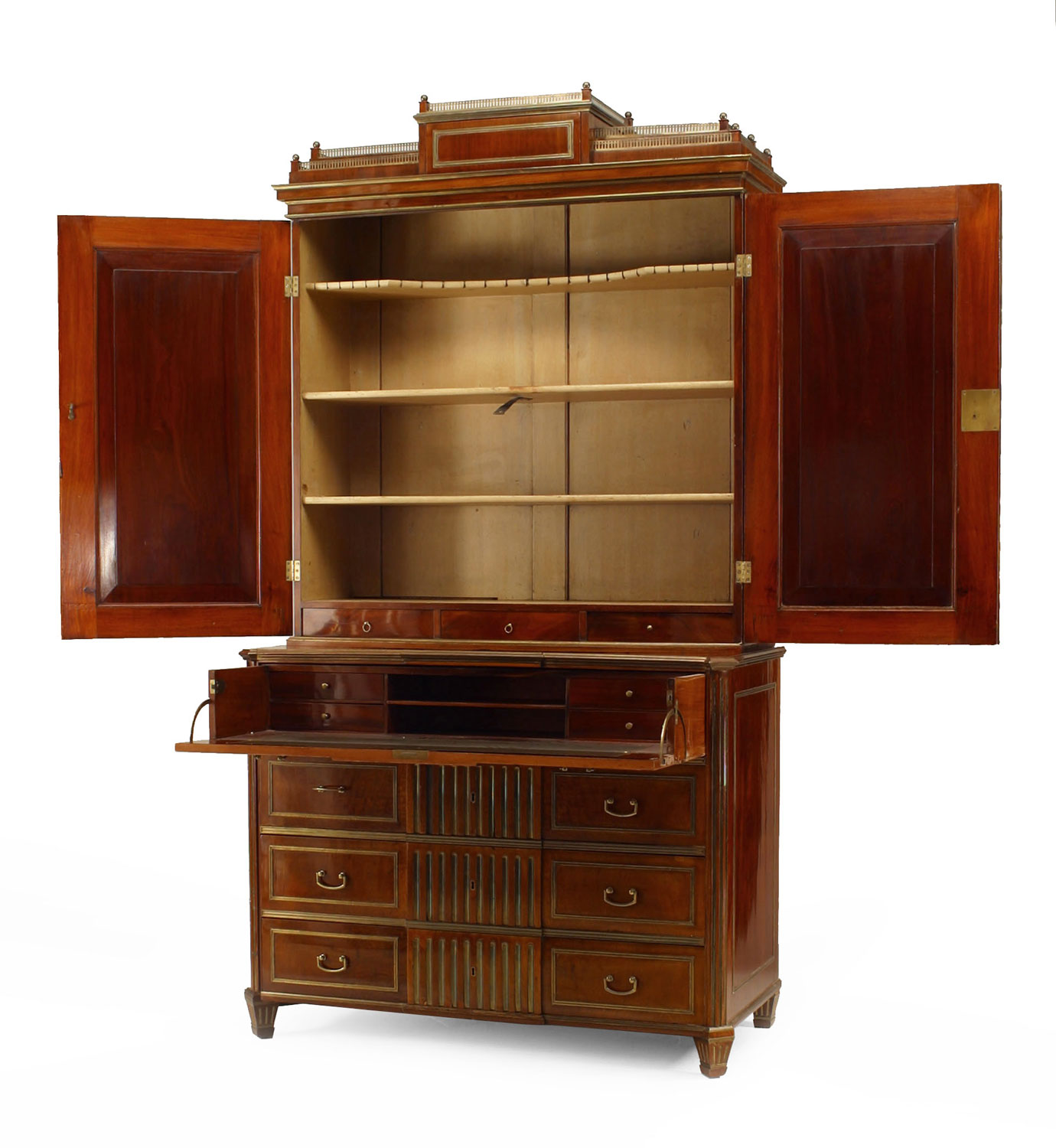 Russian (18th Century) mahogany secretary bookcase with brass gallery pediment and trim with 2 front doors revealing 3 drawers and shelves above a lower section of 4 large drawers.