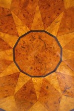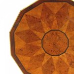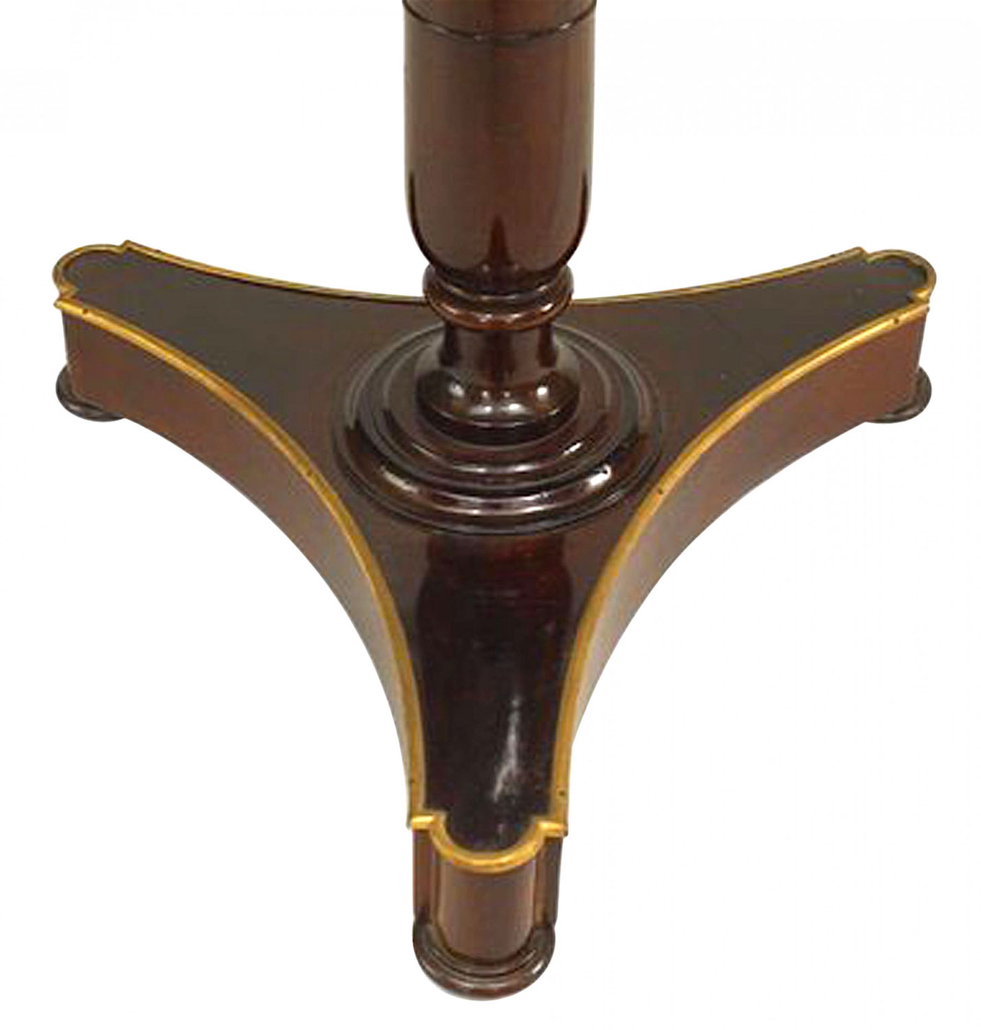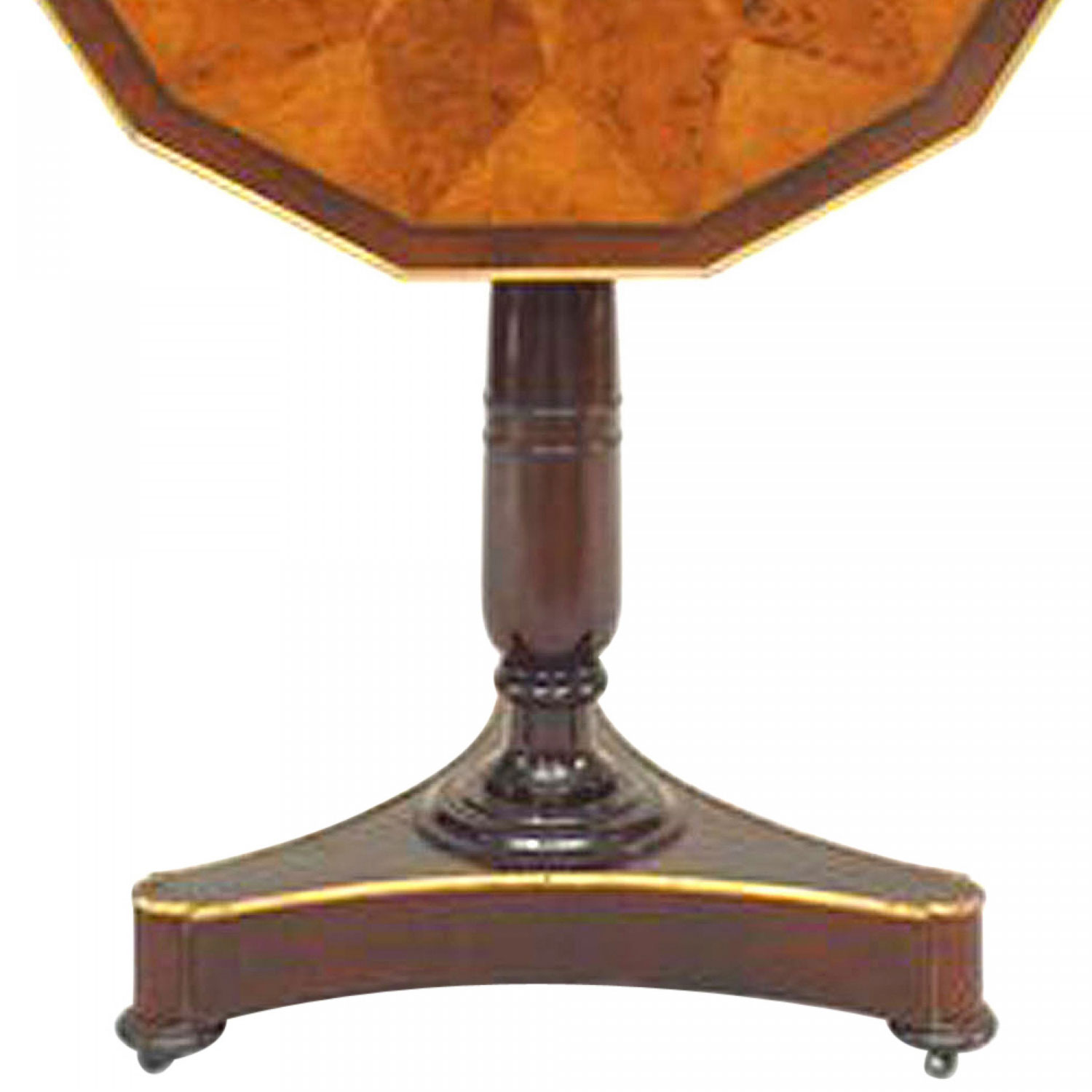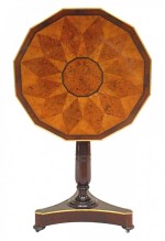 Russian Neoclassic (19th Century) brass mounted mahogany tilt-top table with 12-sided specimen wood parquetry top above an incurved tripartite base.