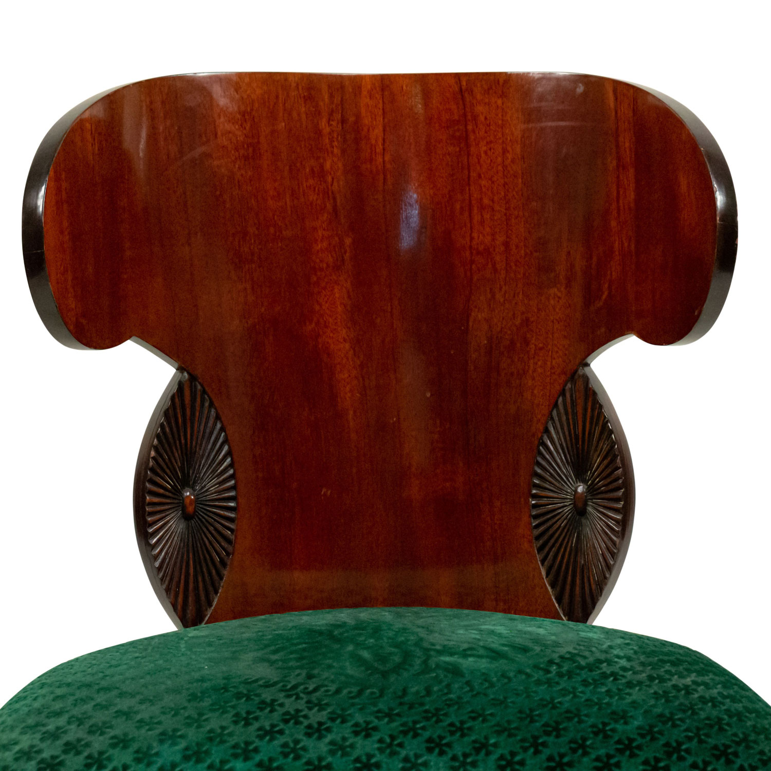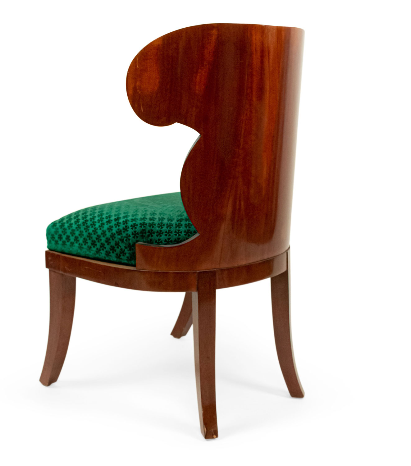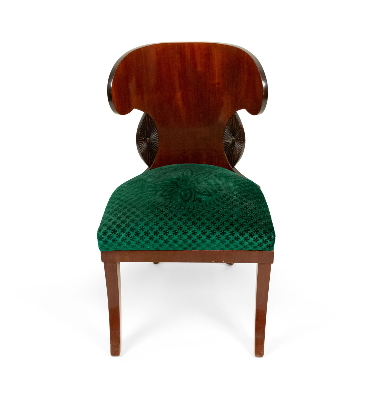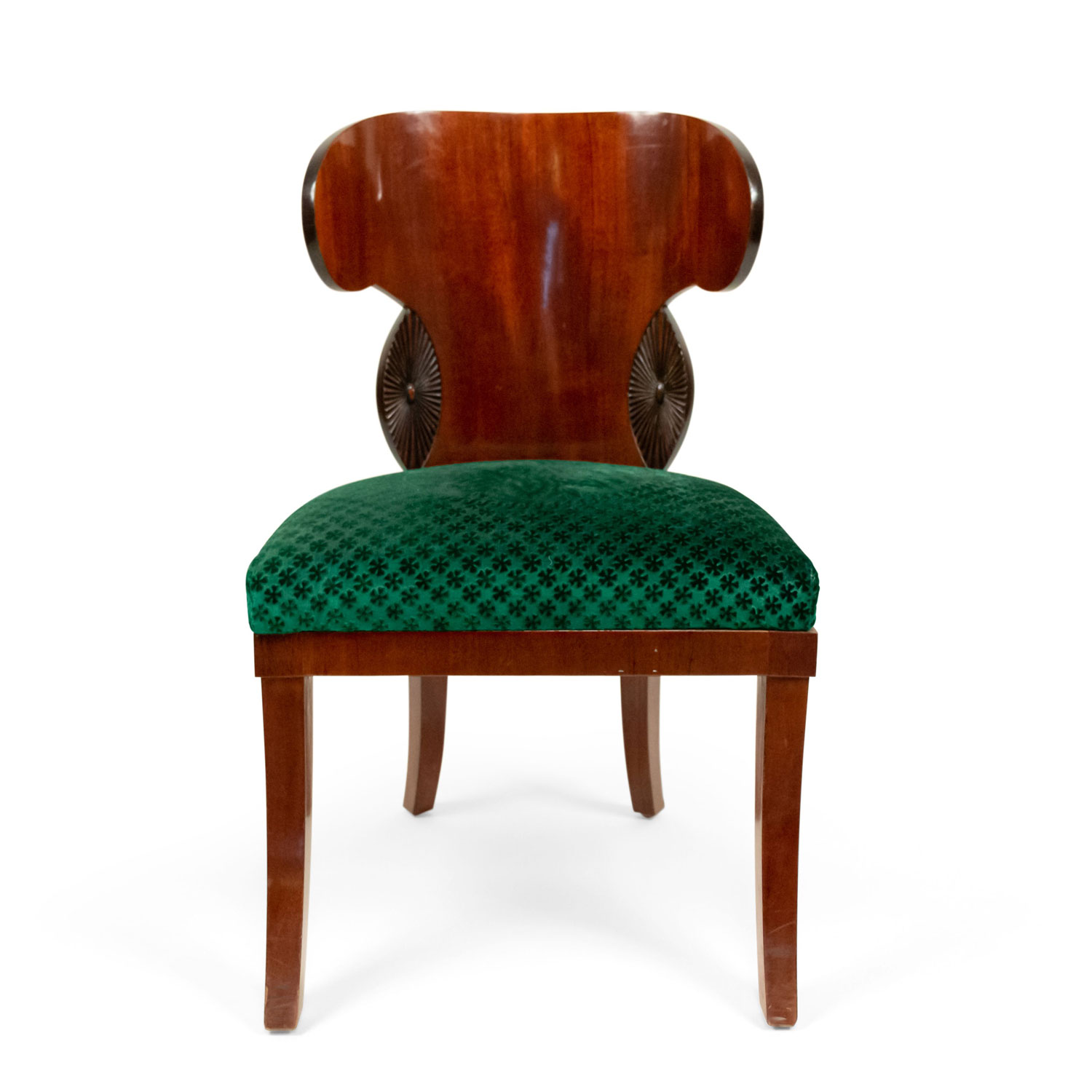Russian Neoclassic style mahogany "klismos" side chair with incurved back above a green velvet upholstered seat. (20th Cent).