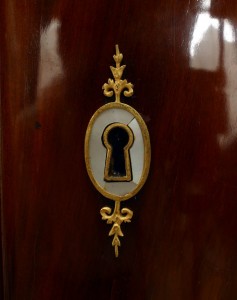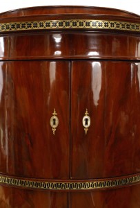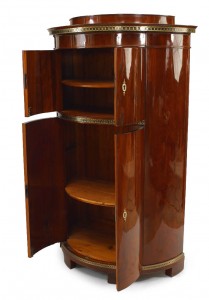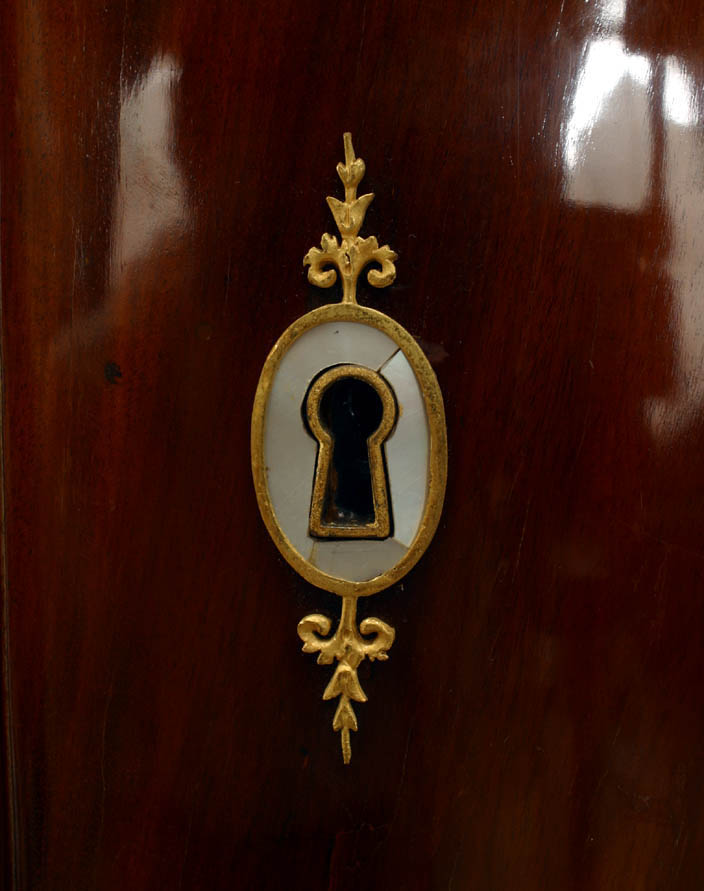 Style: Russian Materials & Techniques: Brass, mahogany, pearl, pediment Category: Cabinets & Case Goods Good; Wear consistent with age and use