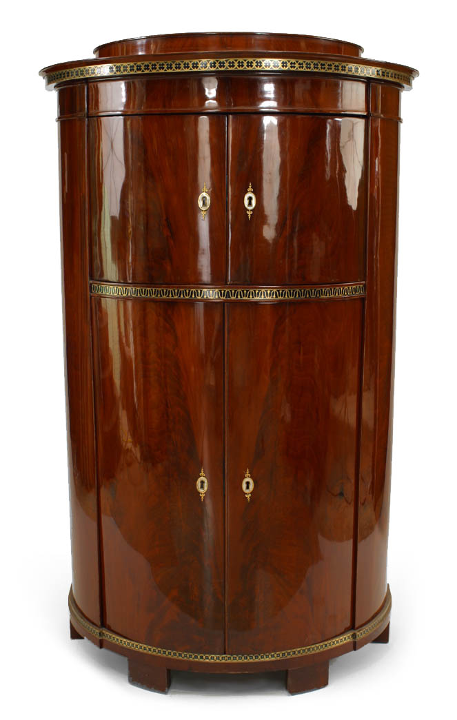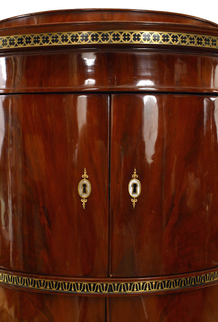 Russian Neoclassic (late 18th/early 19th Century) mother of pearl and brass mounted ebonized and mahogany demilune cabinet with stepped pediment above 2 pairs of doors.