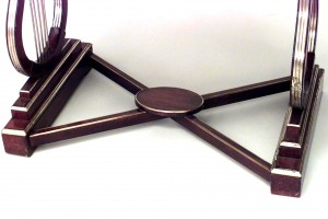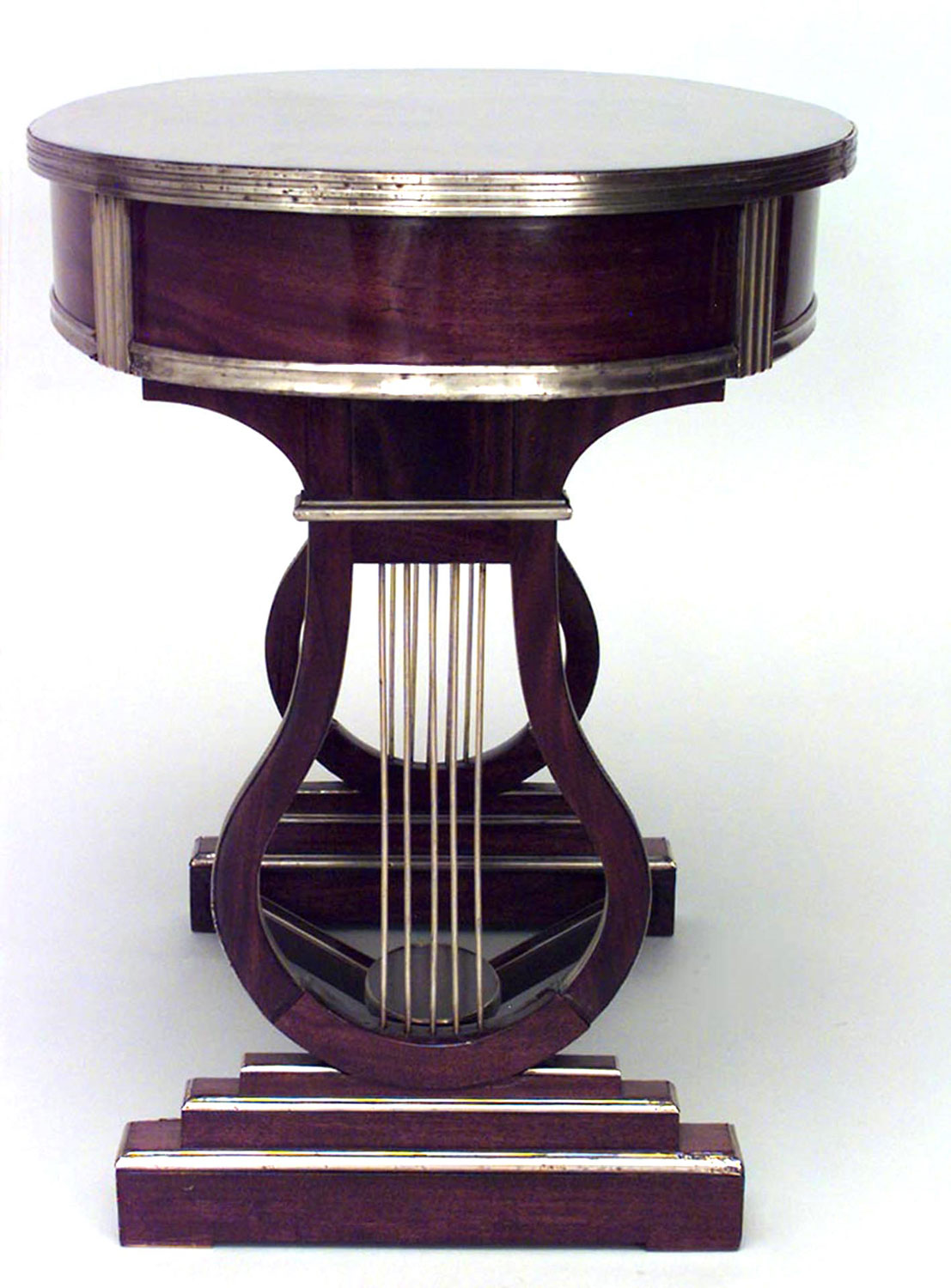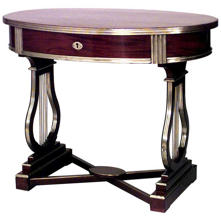 Russian Neoclassic (18/19th Century) brass mounted mahogany writing table with oval top above a frieze drawer on lyre trestle supports joined by a stretcher..