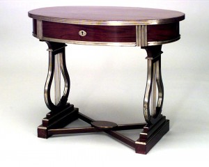 Russian Neoclassic (18/19th Century) brass mounted mahogany writing table with oval top above a frieze drawer on lyre trestle supports joined by a stretcher.