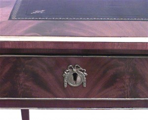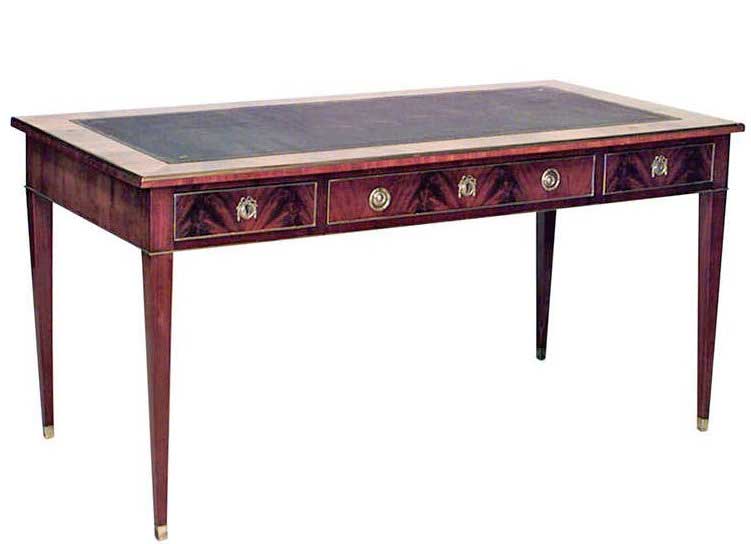 Russian Neoclassic (circa 1800) brass mounted mahogany writing table with green leather inset top above 3 frieze drawers, locks stamped "Ptorngren" or "PTGF"..