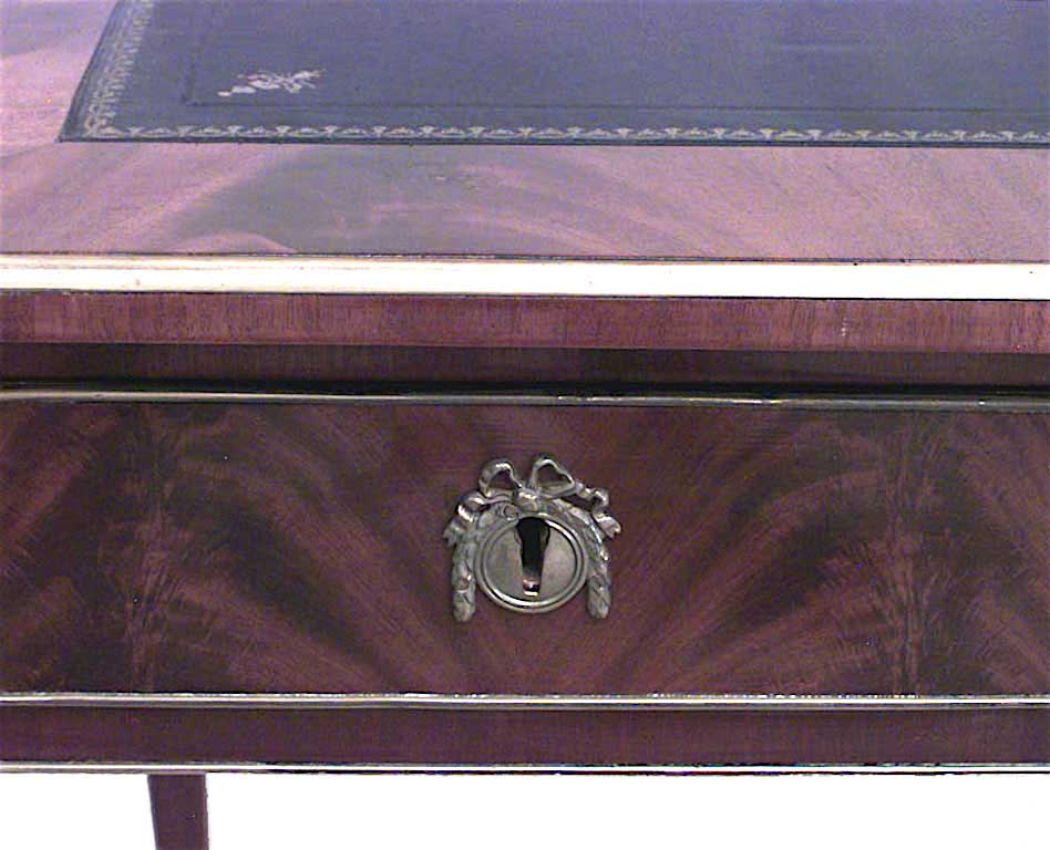 Russian Neoclassic (circa 1800) brass mounted mahogany writing table with green leather inset top above 3 frieze drawers, locks stamped "Ptorngren" or "PTGF".