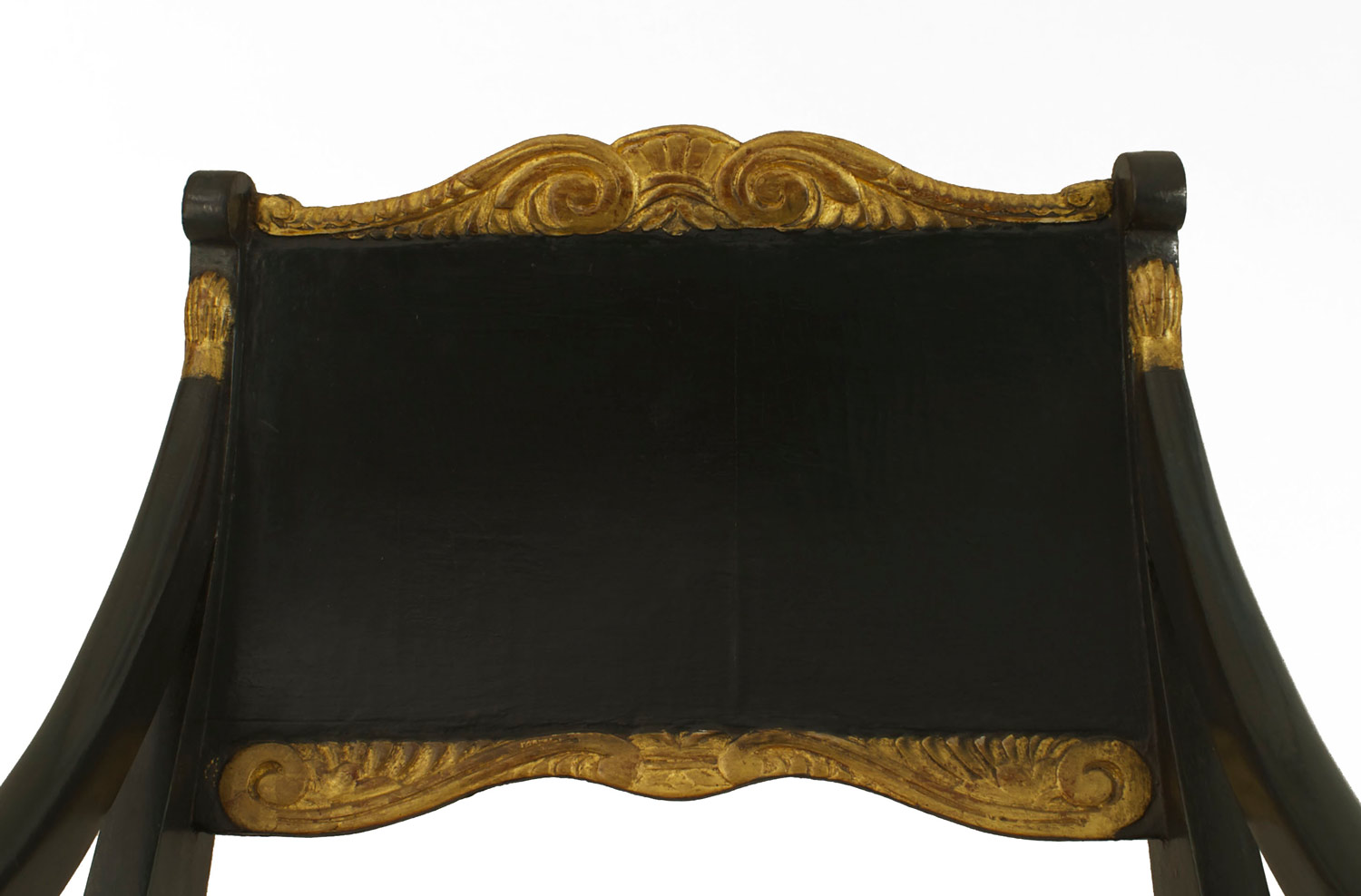 PAIR of Russian Neoclassic (early 19th Century) parcel gilt and dark green painted armchairs with scrolled arms and red damask silk upholstered seats. (PRICED AS PAIR) (Similar to: 018681A)