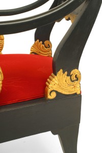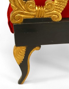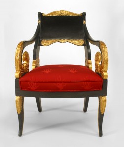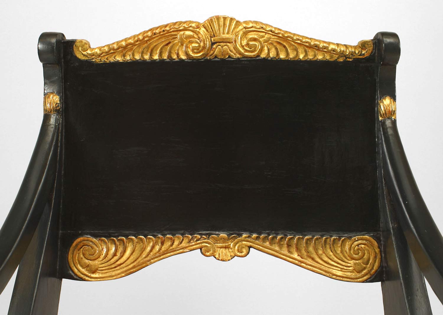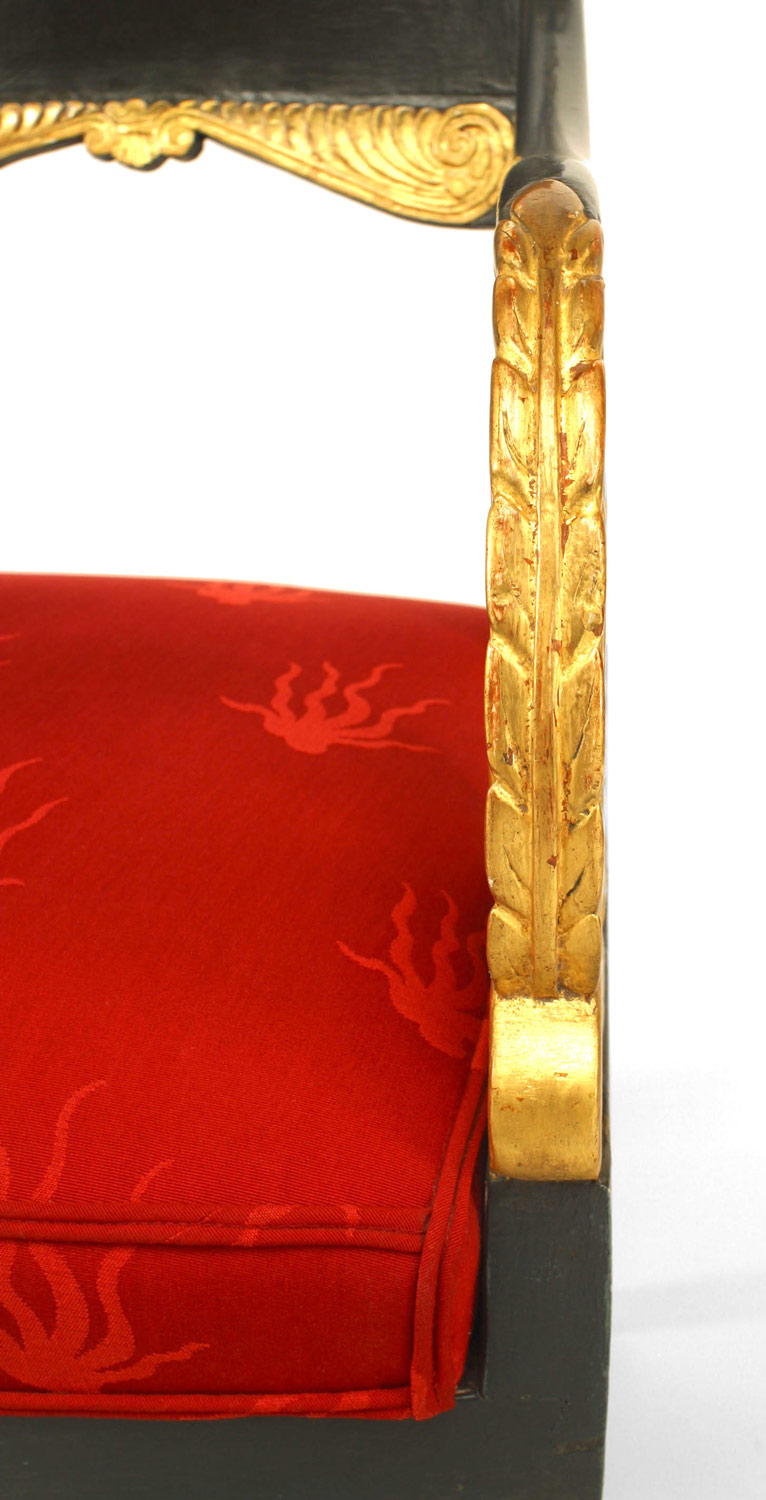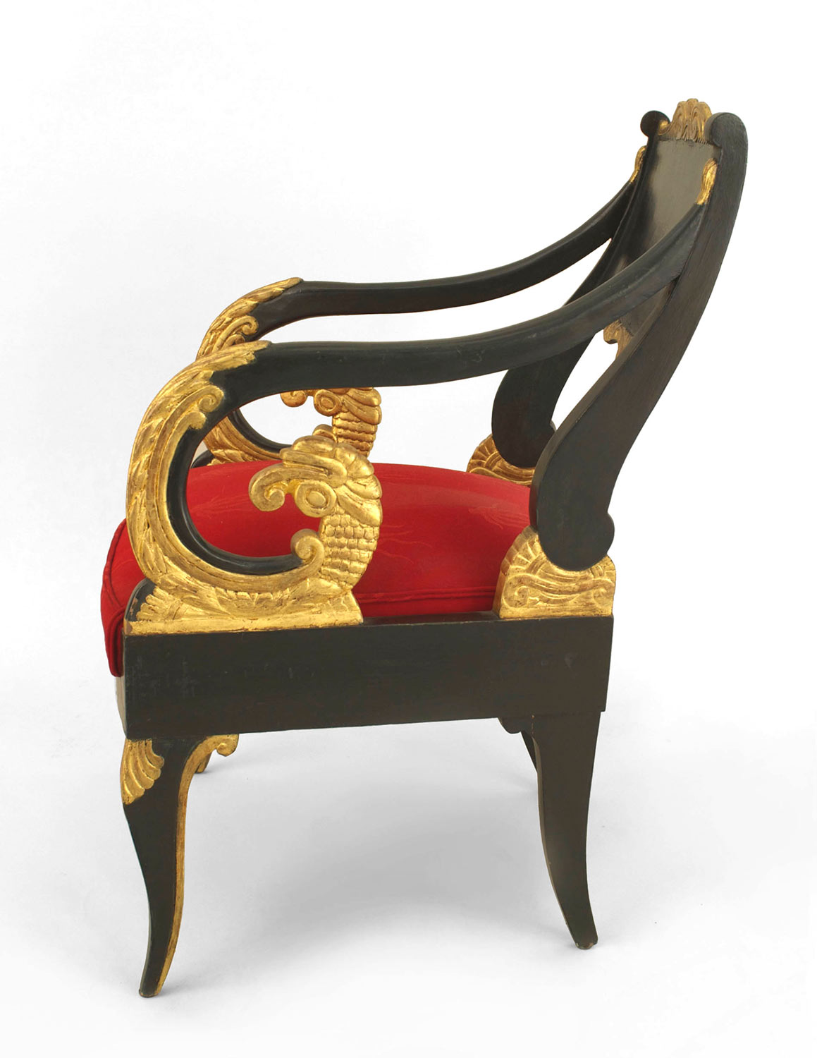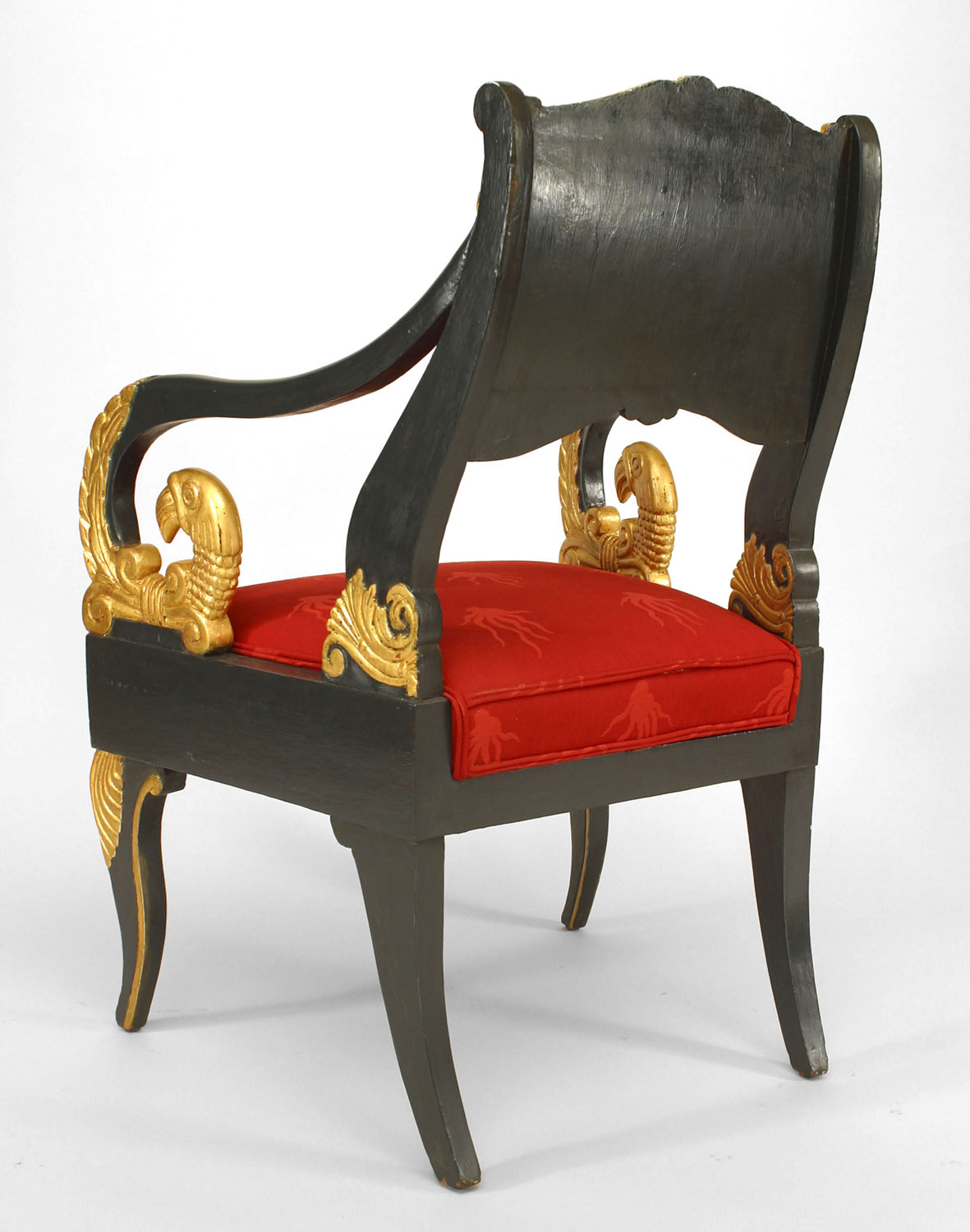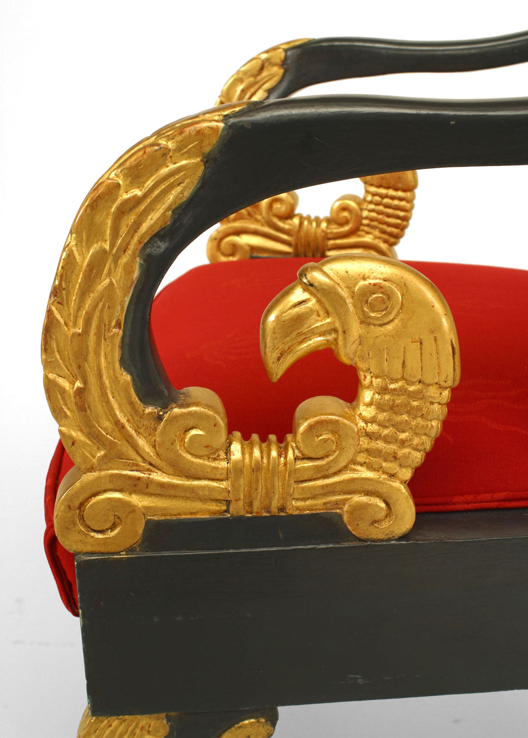 PAIR of Russian Neoclassic (early 19th Century) parcel gilt and dark green painted armchairs with scrolled arms with bird heads and red damask silk upholstered seats. (PRICED AS PAIR) (similar to: 018681)