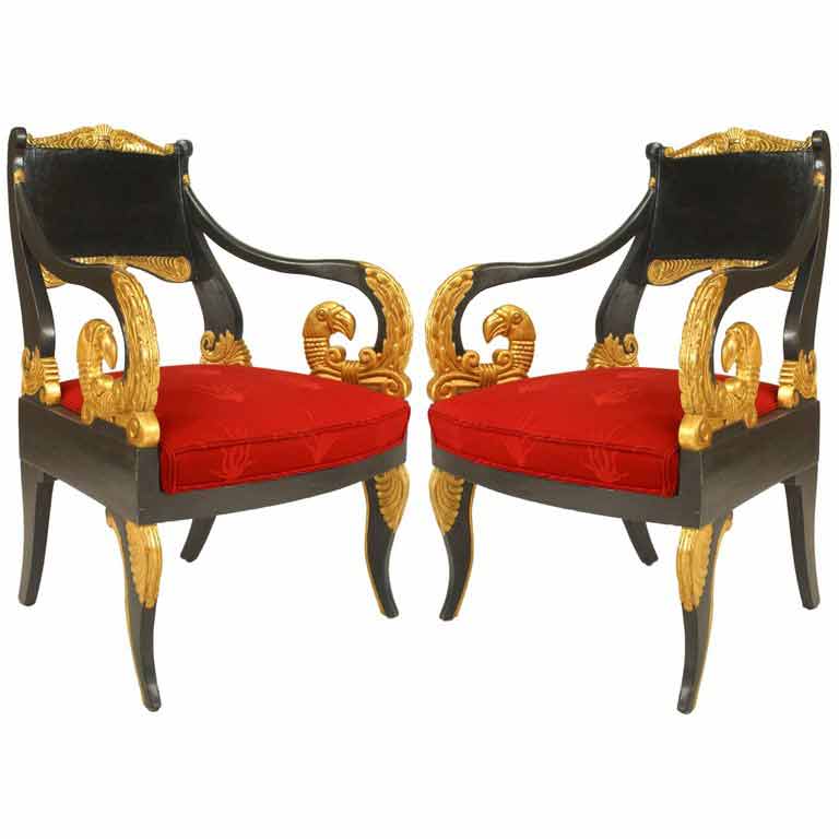 PAIR of Russian Neoclassic (early 19th Century) parcel gilt and dark green painted armchairs with scrolled arms with bird heads and red damask silk upholstered seats. (PRICED AS PAIR) (similar to: 018681).