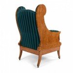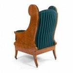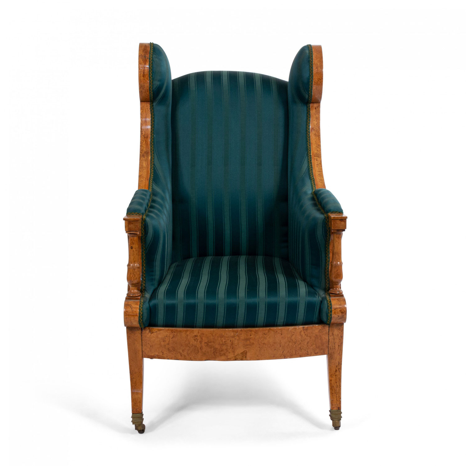 Russian Neoclassic Karelian birch winged armchair upholstered in green striped silk with scrolled sides on splayed legs with casters (19th Century)