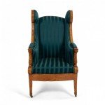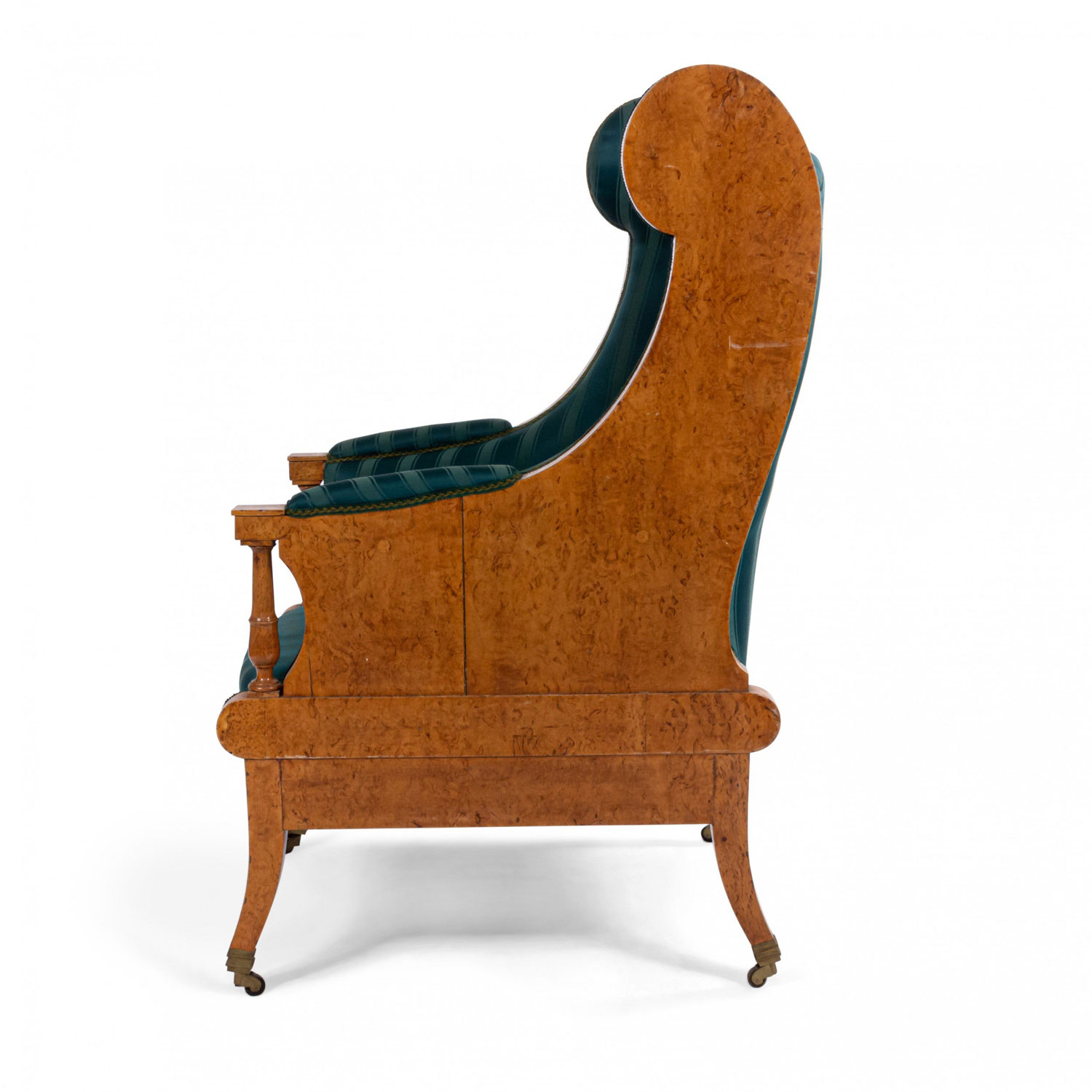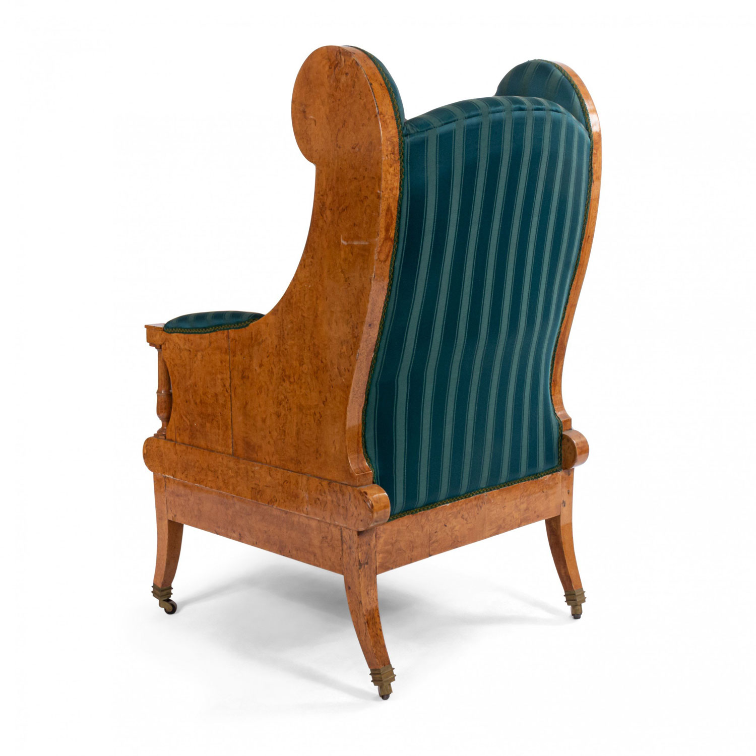 Russian Neoclassic Karelian birch winged armchair upholstered in green striped silk with scrolled sides on splayed legs with casters (19th Century).