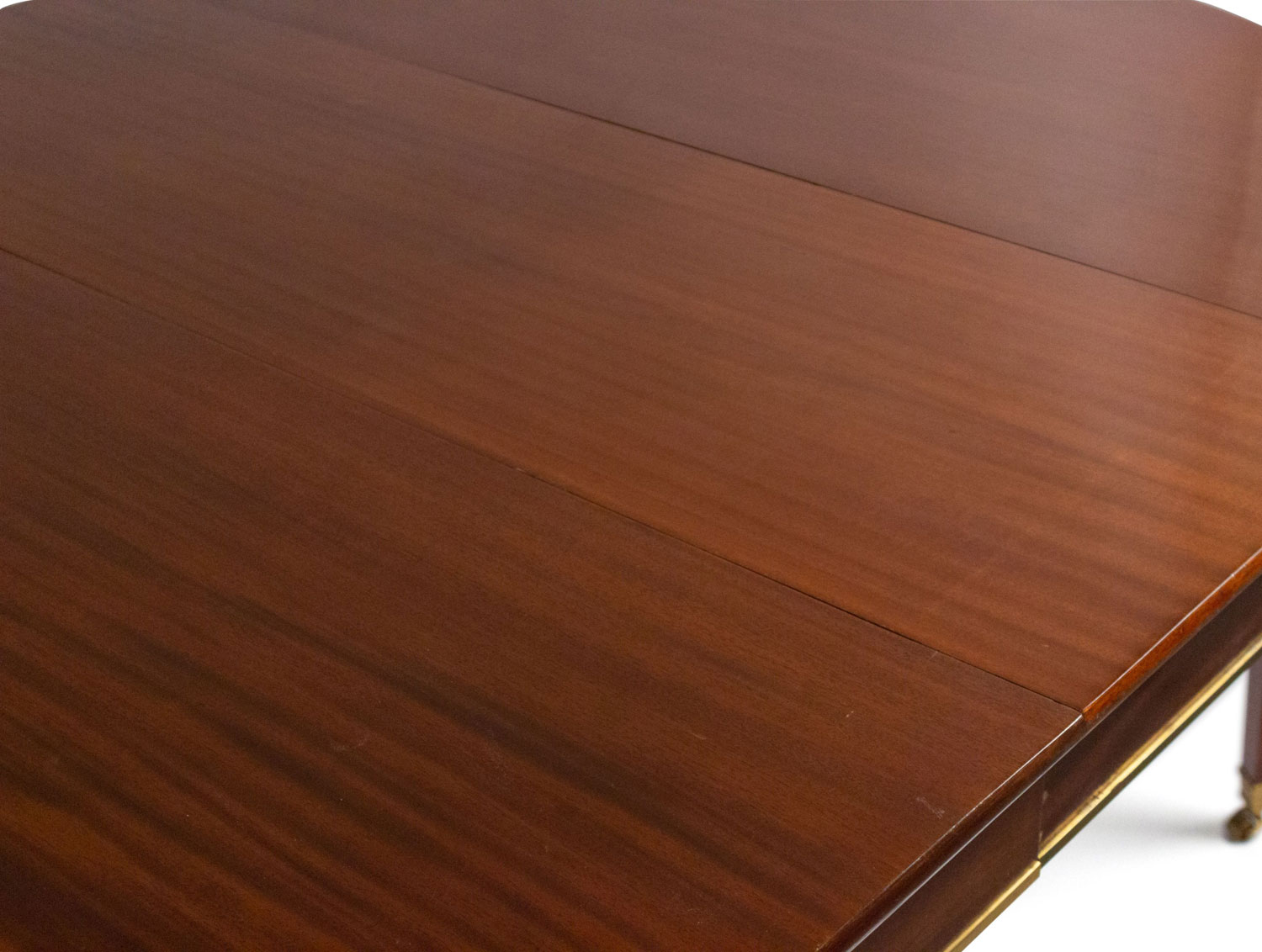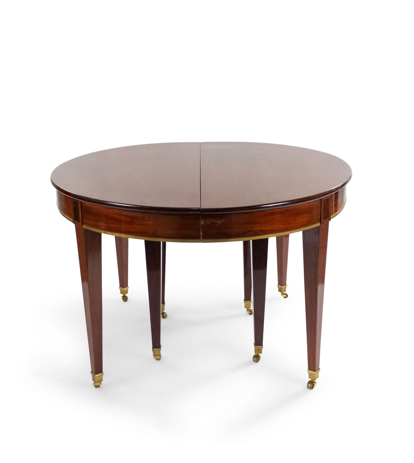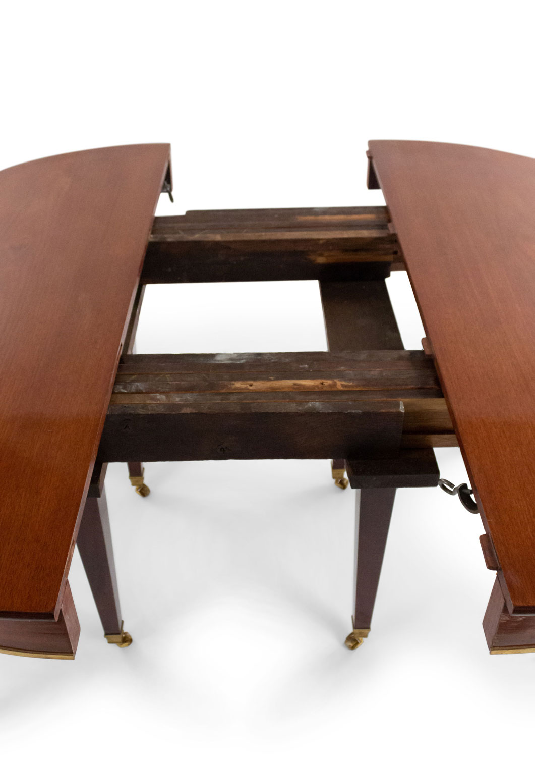 Russian Neoclassic-style (Late 19th Century) brass mounted mahogany extending dining table with rounded ends over an apron on tapering legs. (4 leaves - 17½ inches each).