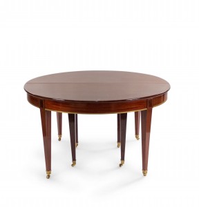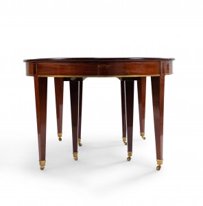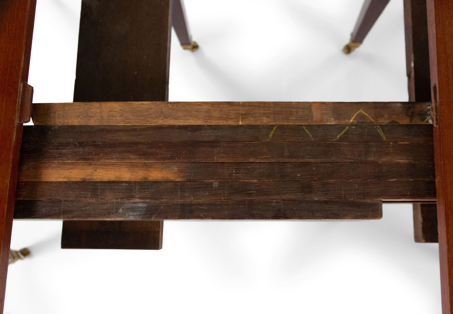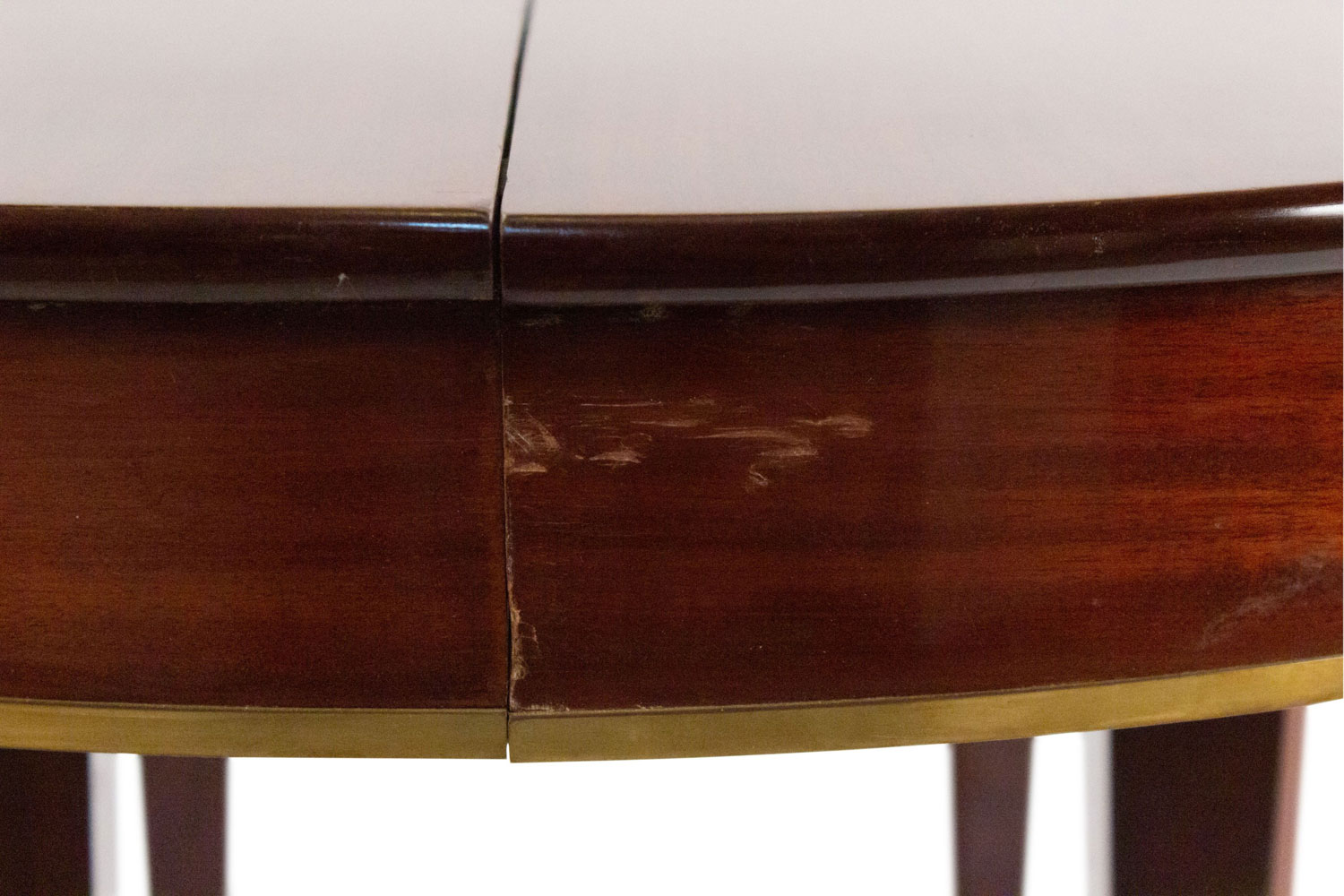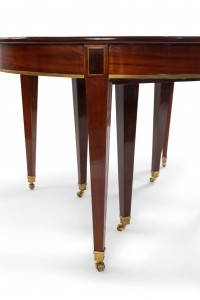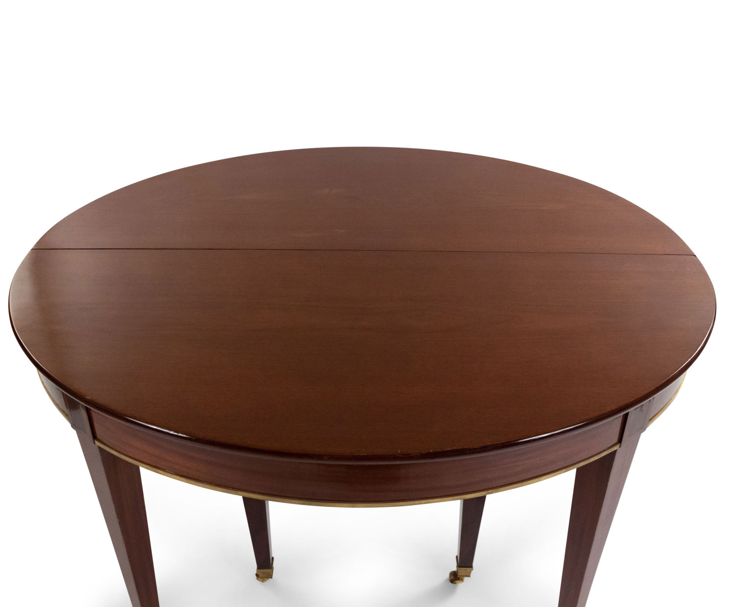 Russian Neoclassic-style (Late 19th Century) brass mounted mahogany extending dining table with rounded ends over an apron on tapering legs. (4 leaves - 17½ inches each).