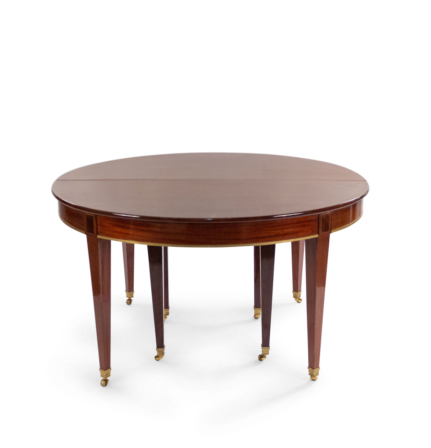Russian Neoclassic-style (Late 19th Century) brass mounted mahogany extending dining table with rounded ends over an apron on tapering legs. (4 leaves - 17½ inches each)