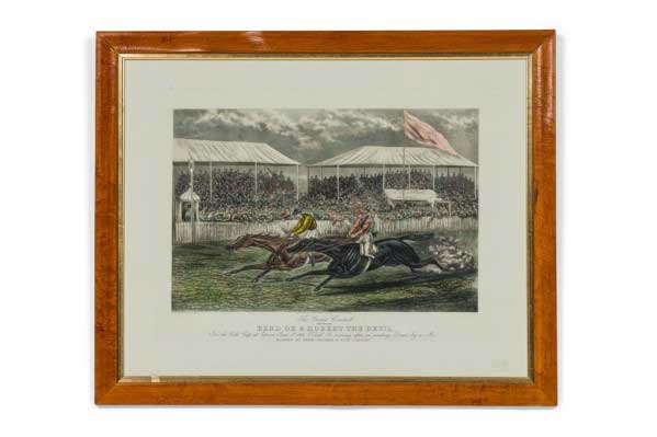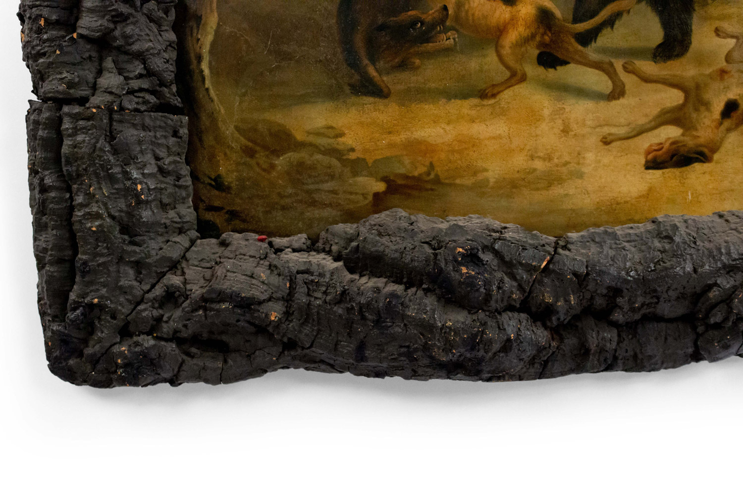 PAIR of Rustic Adirondack style (1940s) mezzotint hunt scene pictures framed in carved bark (PRICED AS PAIR) (Similar pair: 056178)