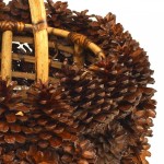 Rustic Adirondack-style (1940s) oval picnic basket covered with large pine cones and a bamboo hoop handle.