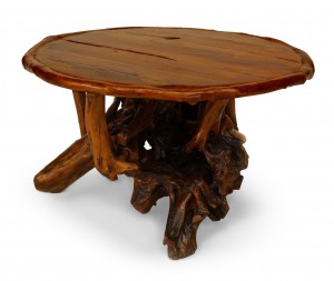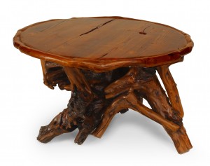 Rustic Adirondack-style (modern) round coffee table with root pedestal bases with 3 legs..