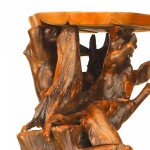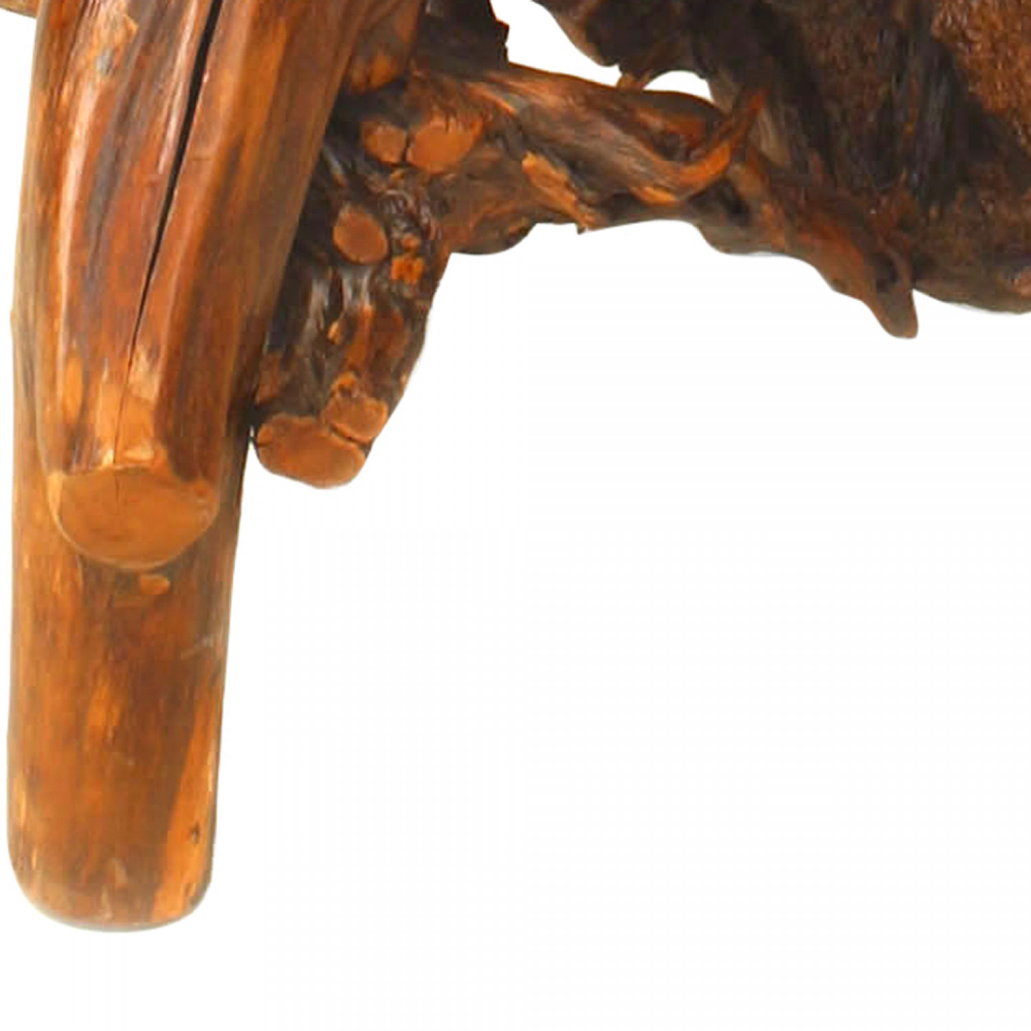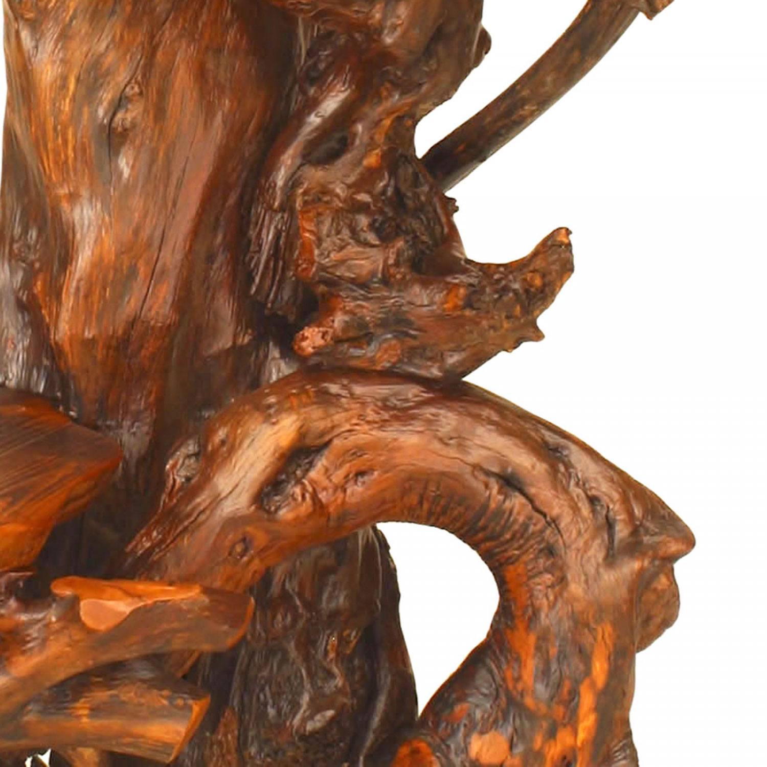 Rustic Adirondack style (modern) root design plant stand/pedestal with 3 shelves and an asymmetrical form supported on 3 feet..