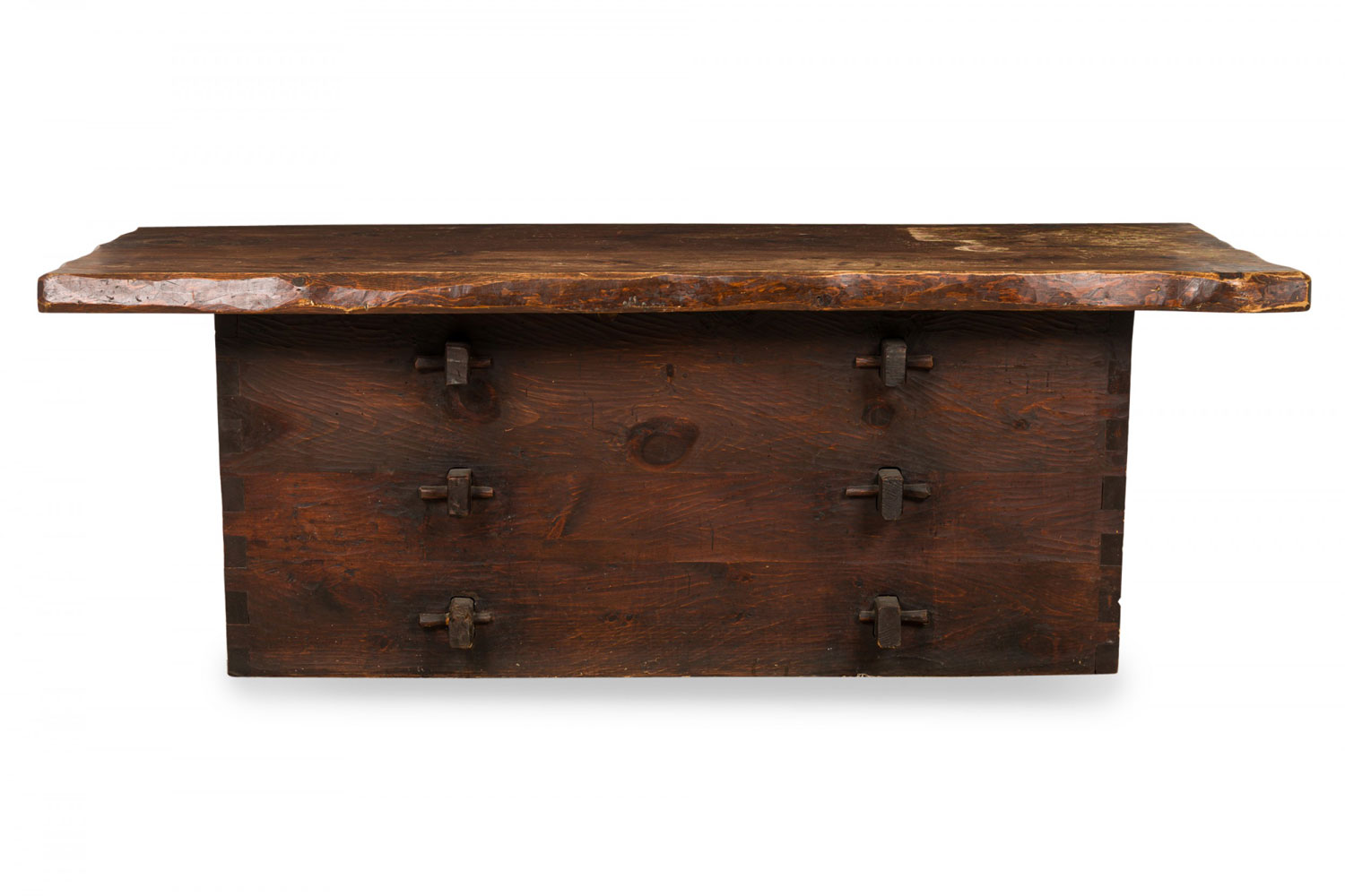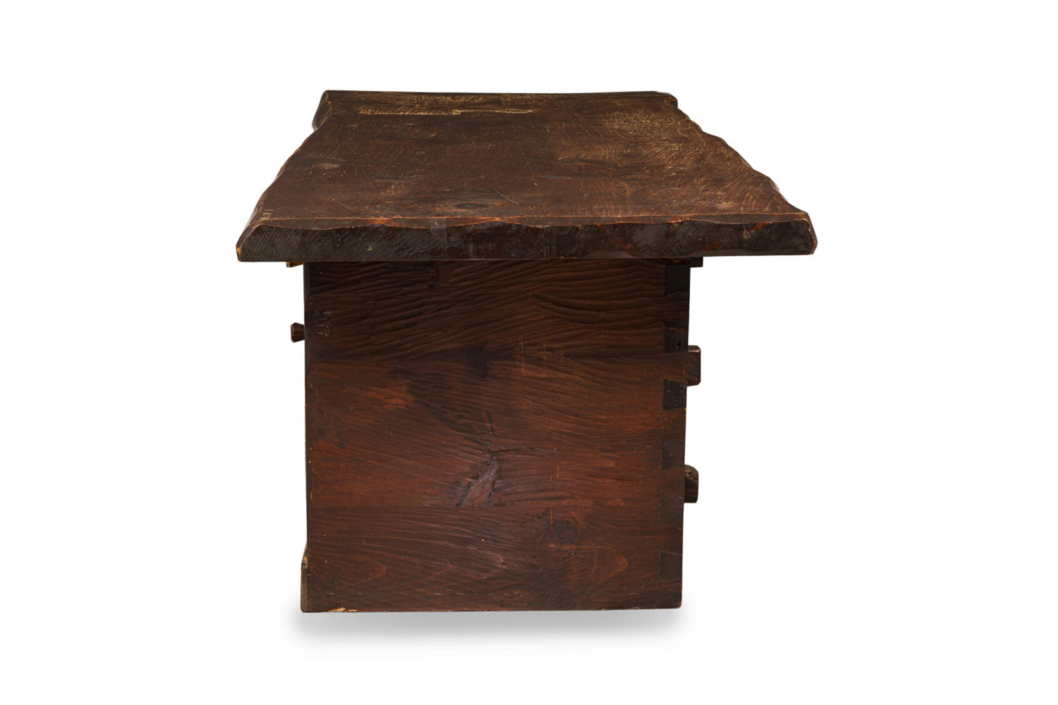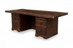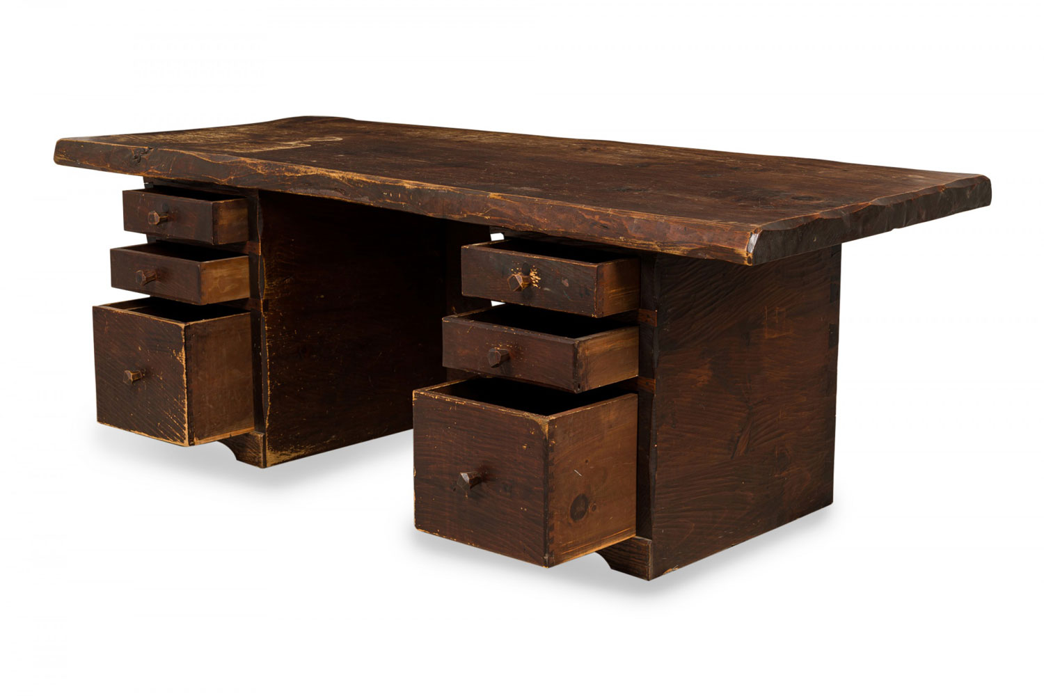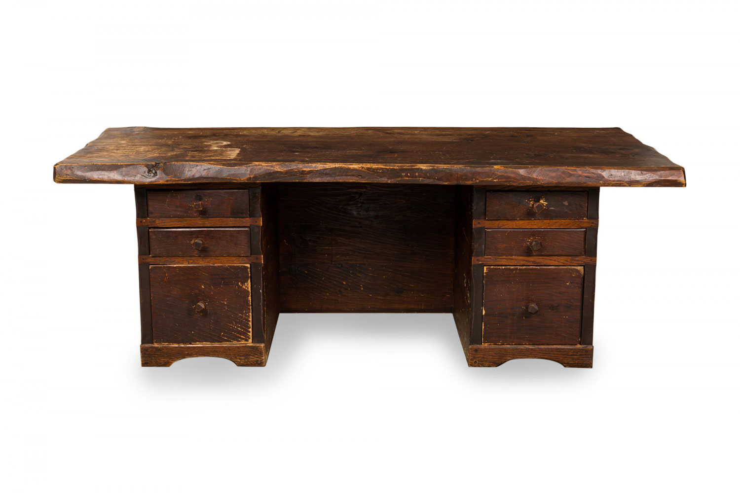 Rustic Adirondack (2nd quarter 20th Century) heavy wooden executive desk with a hewn solid wooden desktop supported by two pedestal bases, each containing three drawers with carved wooden drawer pulls and a front privacy panel connected with tusk and tenon joints..