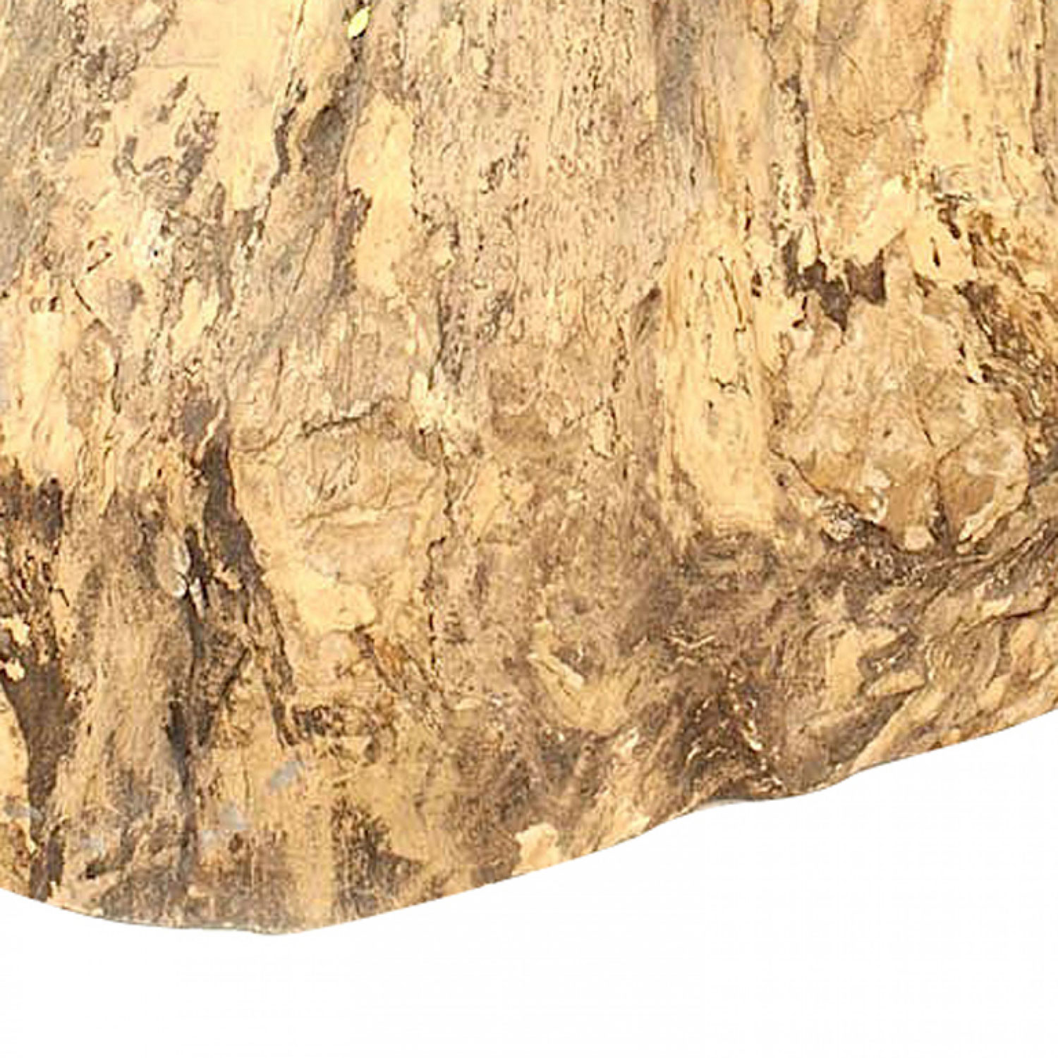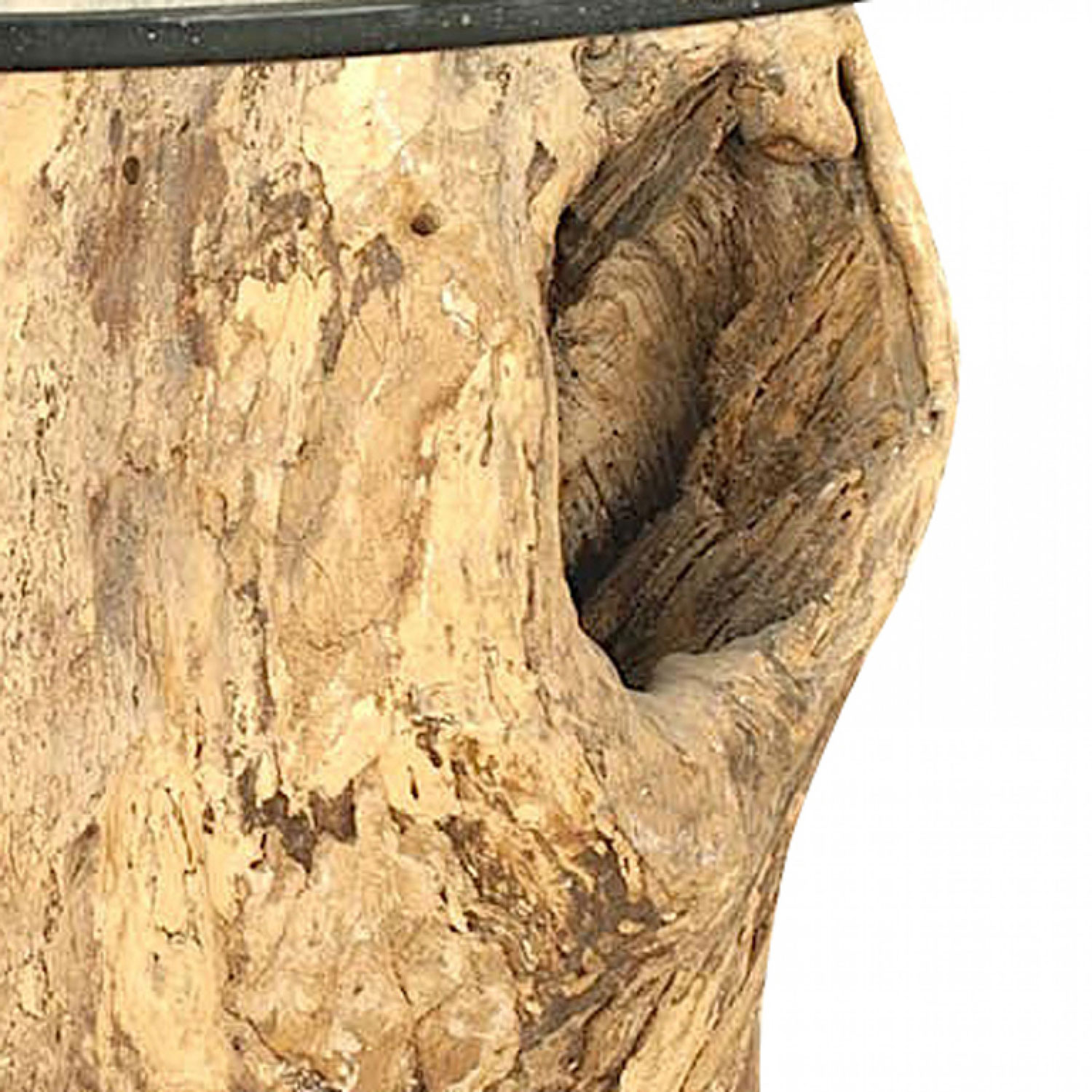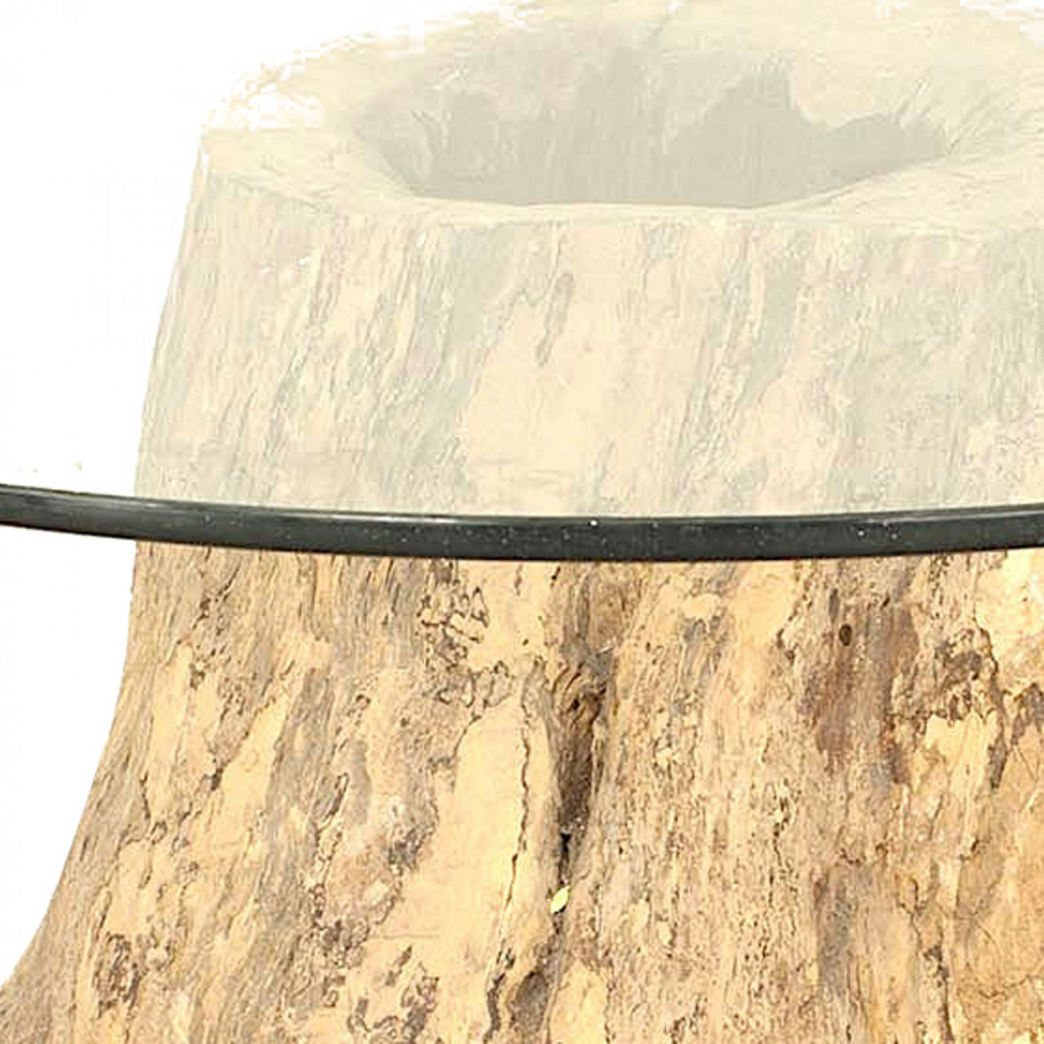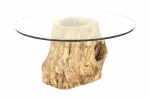 Rustic Adirondack-Style large tree trunk base dining table supporting a round glass top.