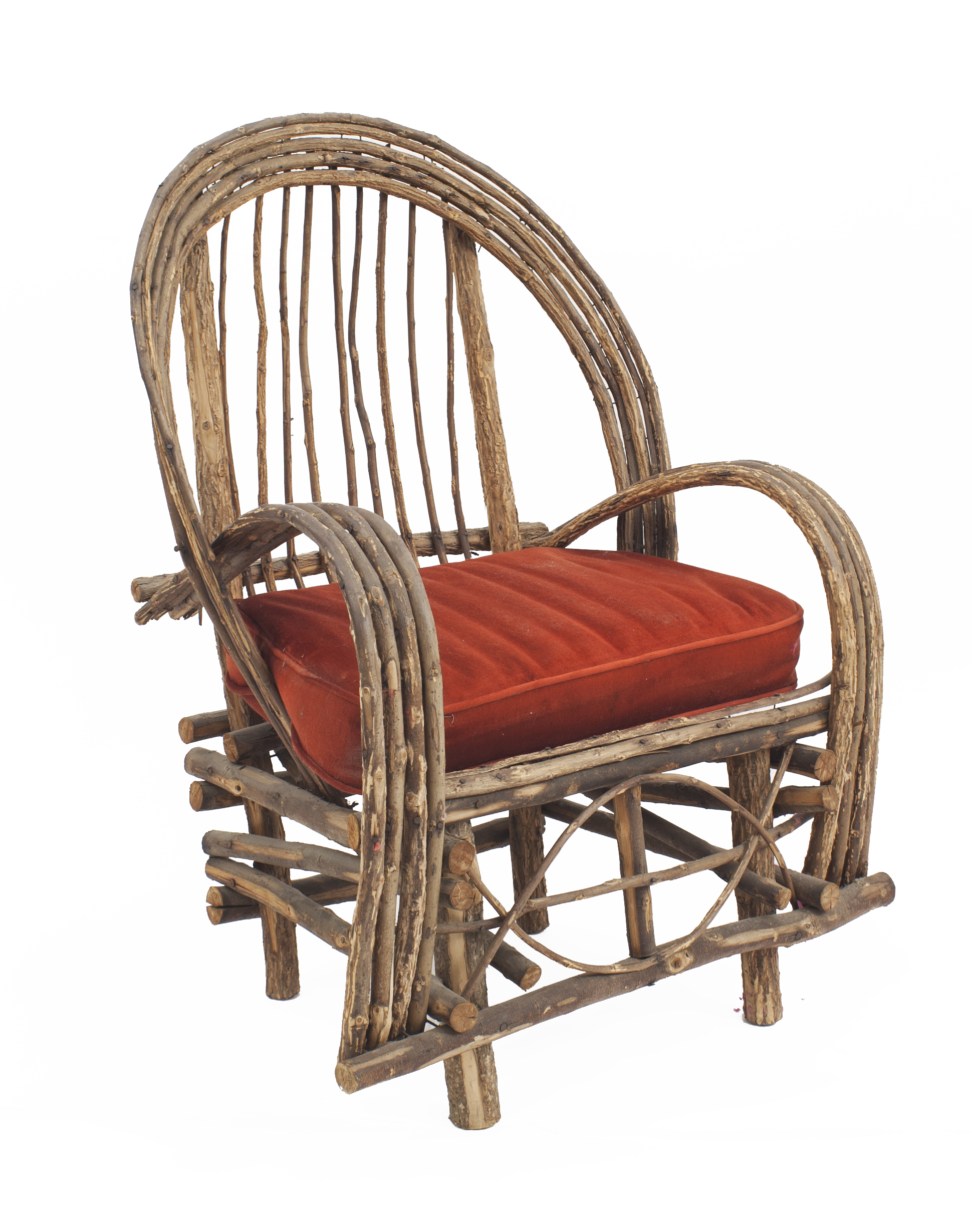 Rustic Adirondack style bent willow armchair with round slat back, rounded arms, and red seat cushion (Matching loveseat: MP2289, rocking chair: MP2291