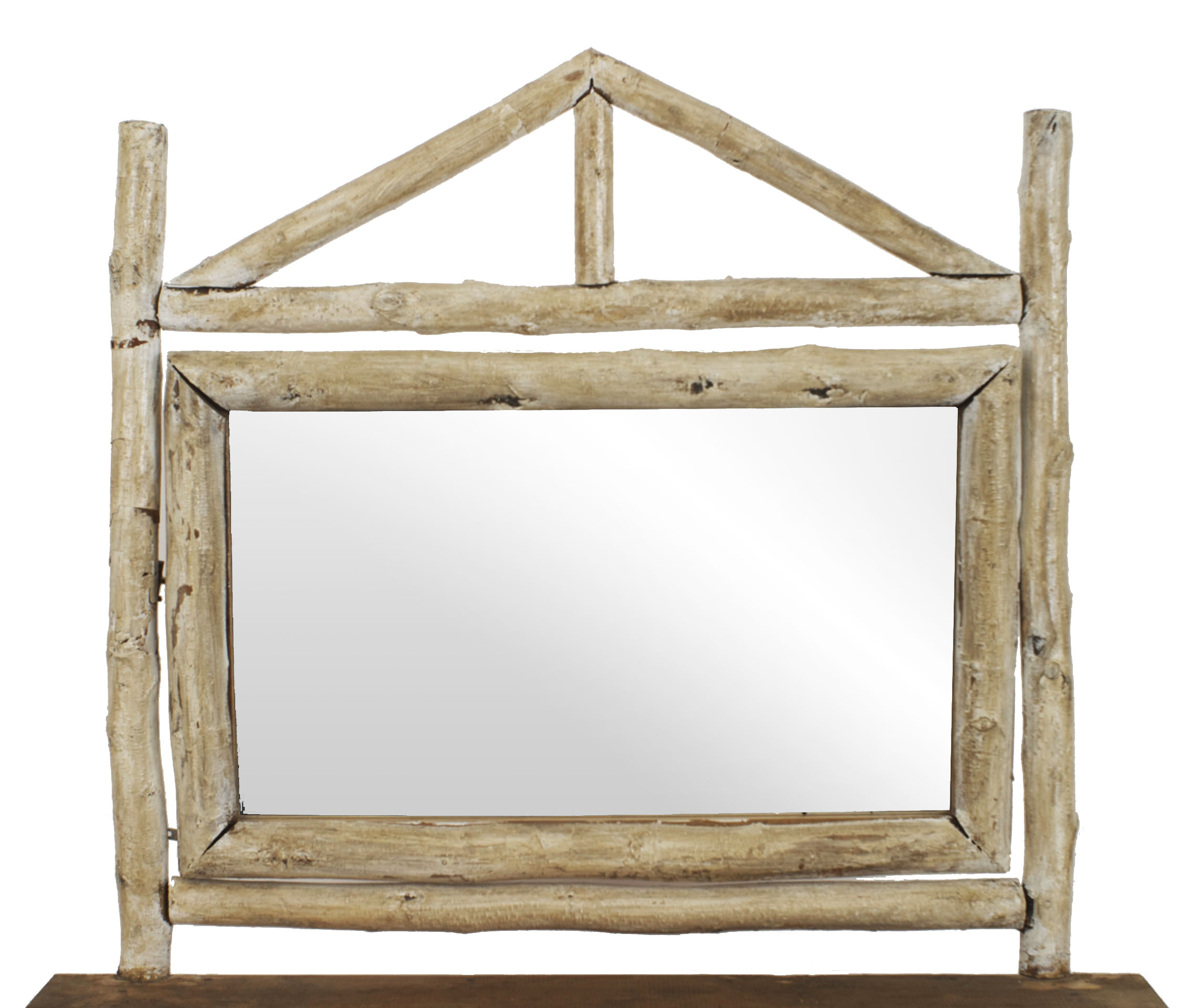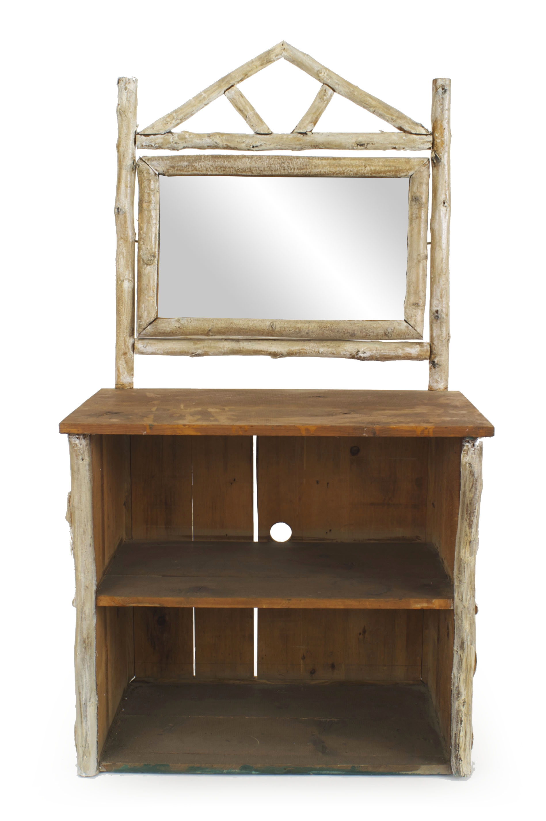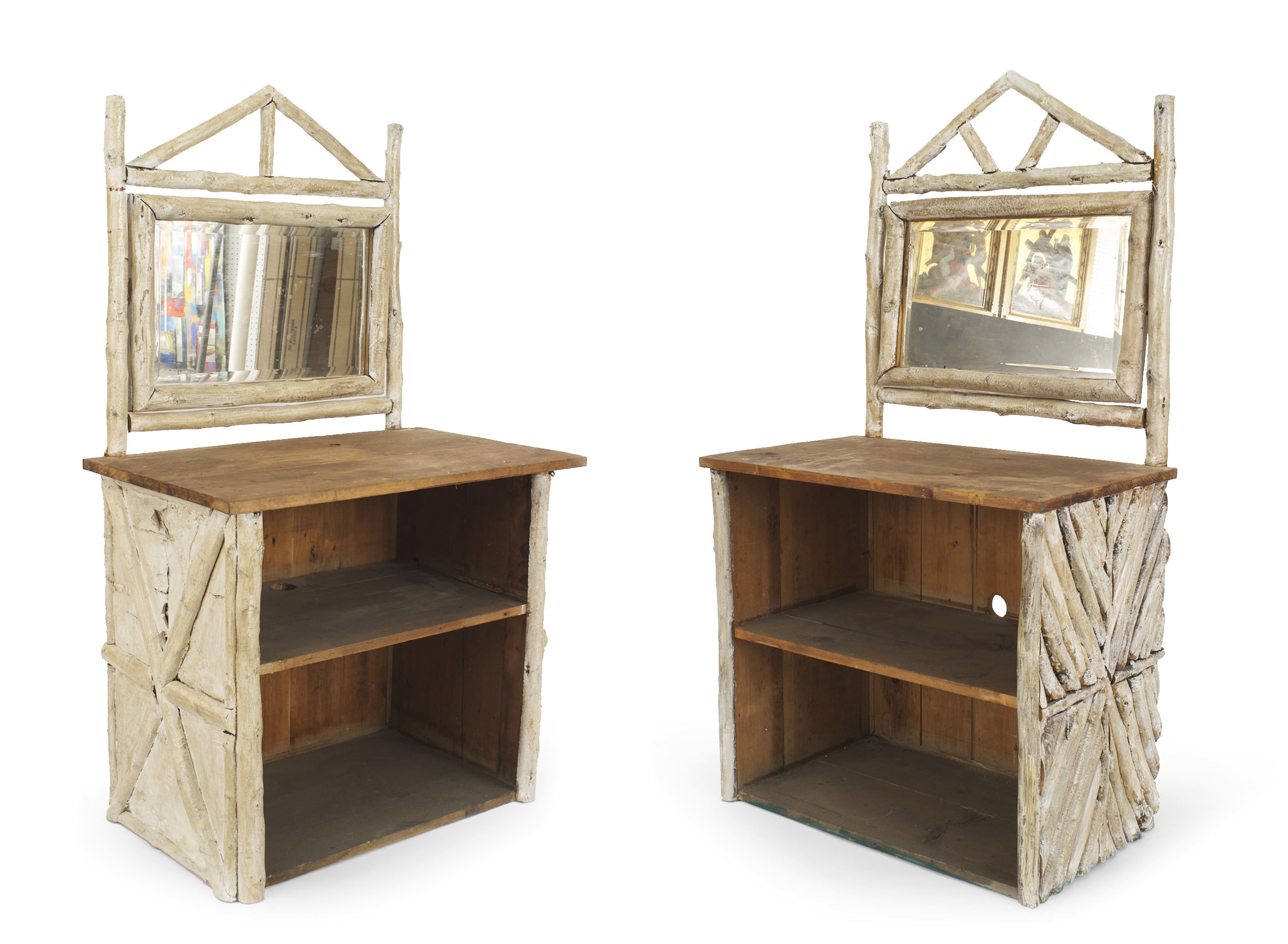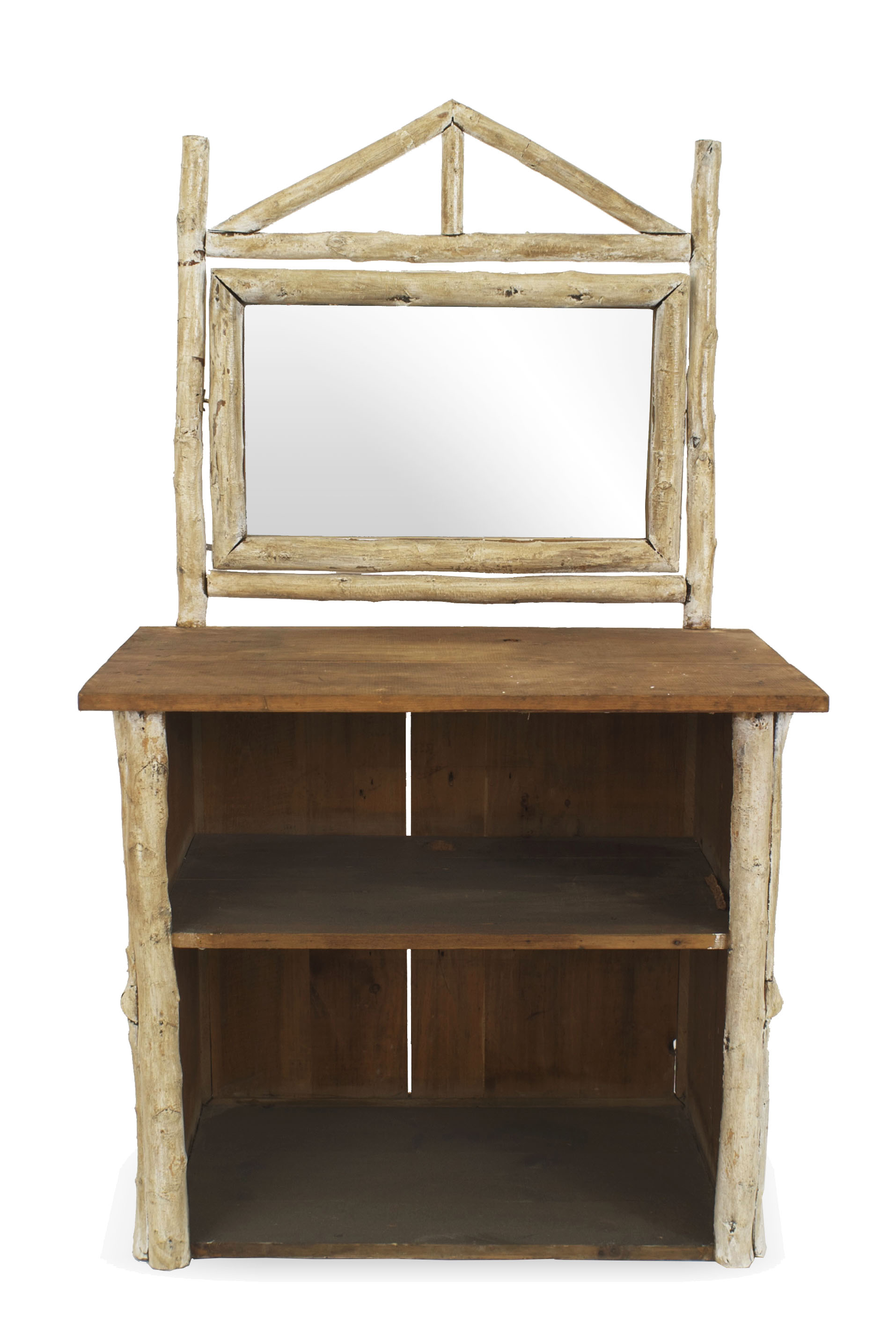 2 Similar Rustic American Adirondack (1920s) birch wood and bark dresser cabinets with 2 open shelves under a pine top with a mirror having a pediment framed top (PRICED EACH).