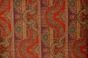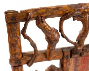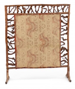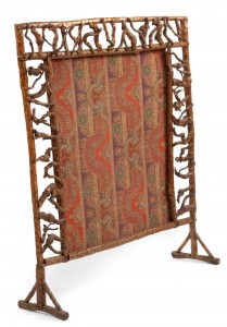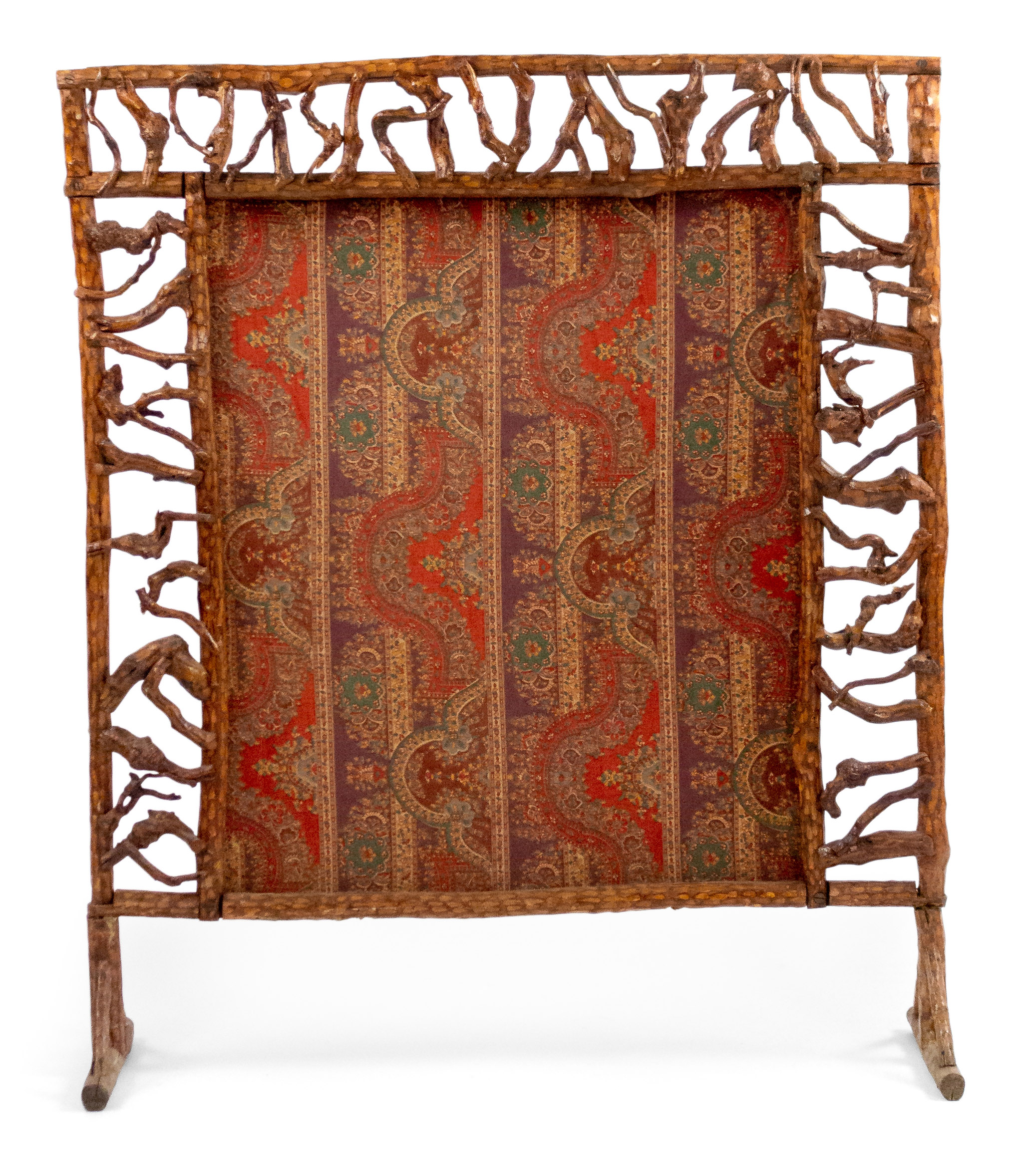 American Rustic Adirondack-style (19/20th Century) twig filigree framed fire screen stand with paisley upholstery (Attributed to Ben Davis).