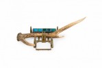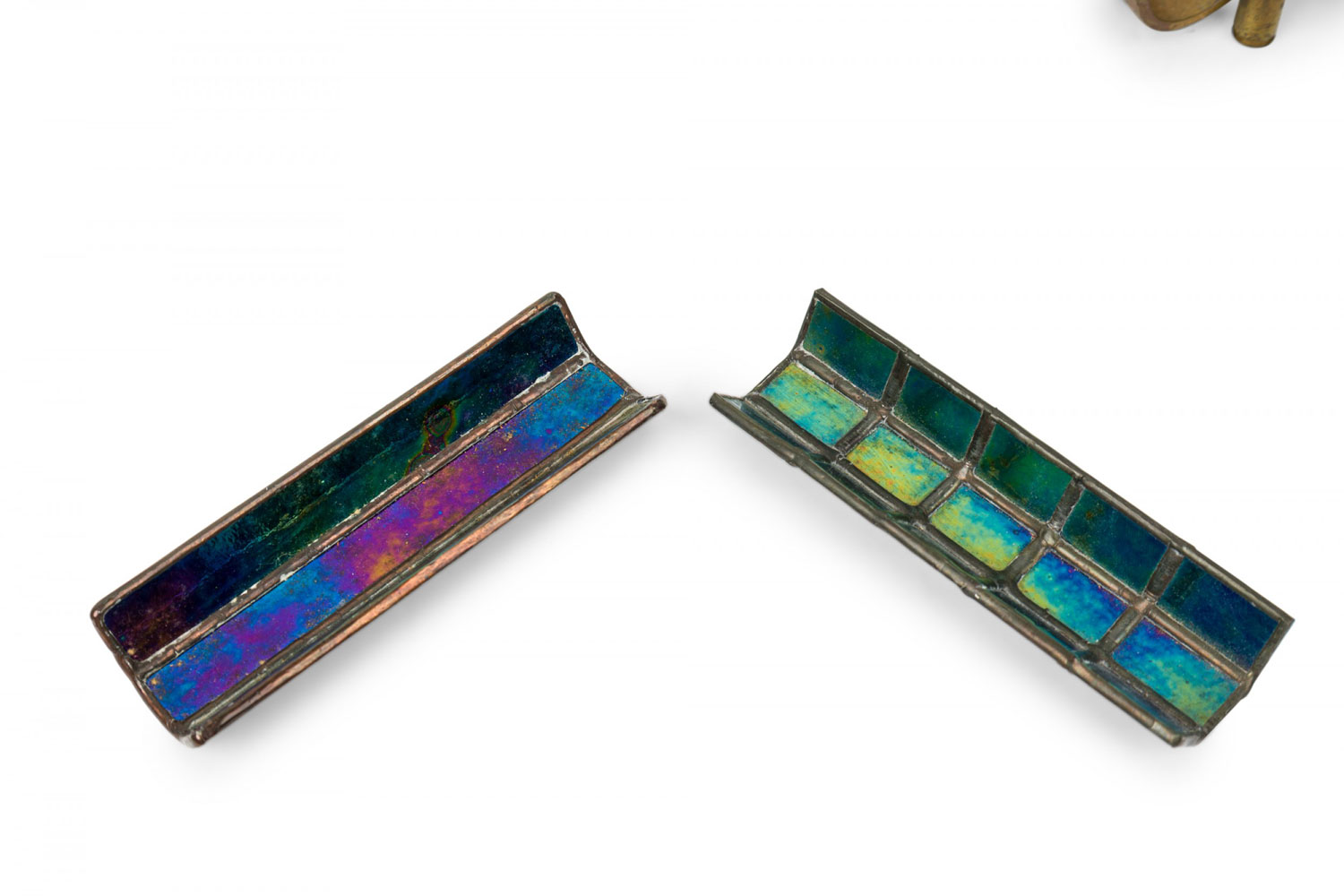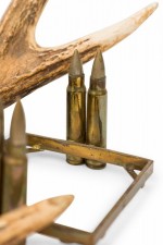 Rustic desk object / inkwell holder made of a deer antler mounted on a metal armature with bullet casings along the sides creating a compartment for a square inkwell adjoining a blue slag glass and metal pen holder.
