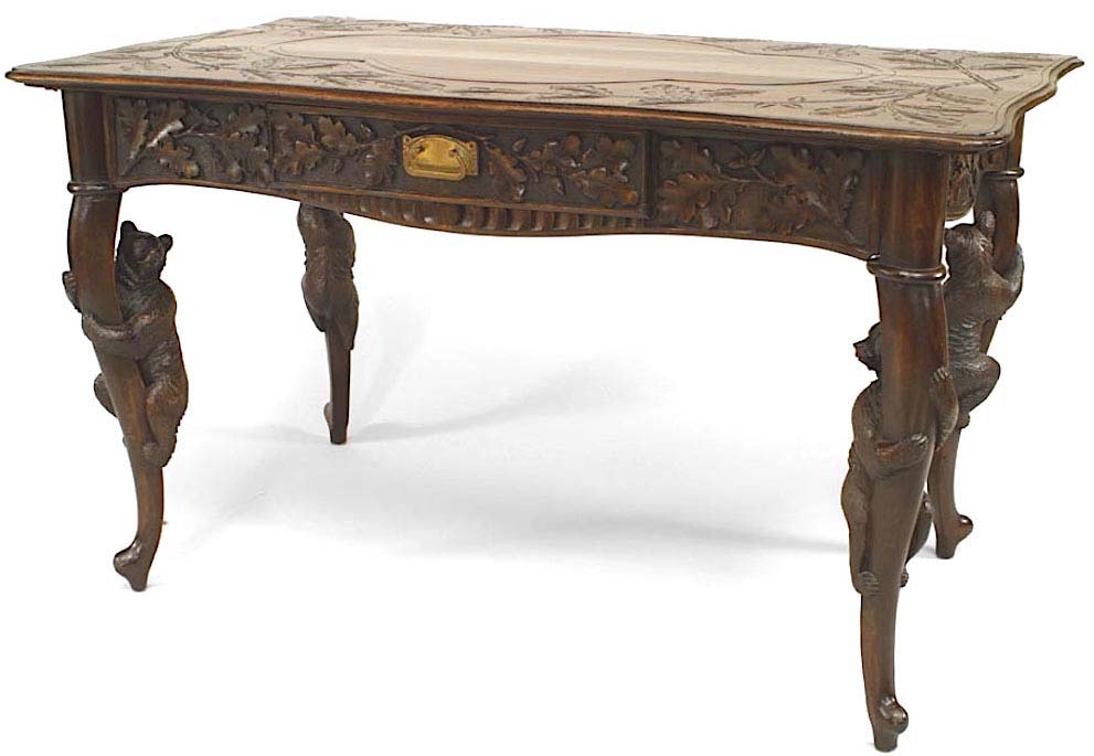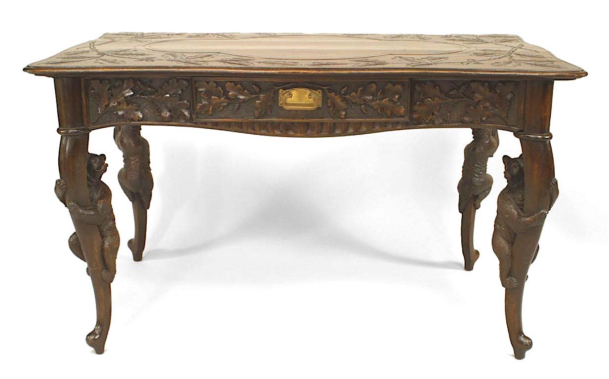 Rustic Black Forest (19th Century) bear carved walnut table desk with leaf and floral carving and single drawer..