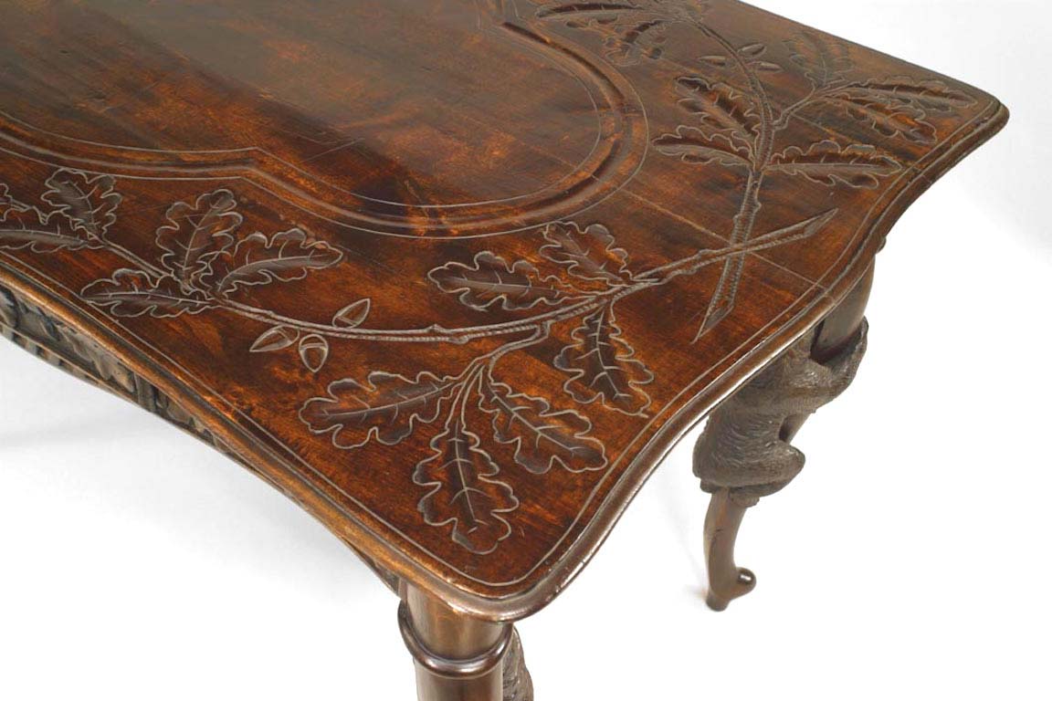 Rustic Black Forest (19th Century) bear carved walnut table desk with leaf and floral carving and single drawer.