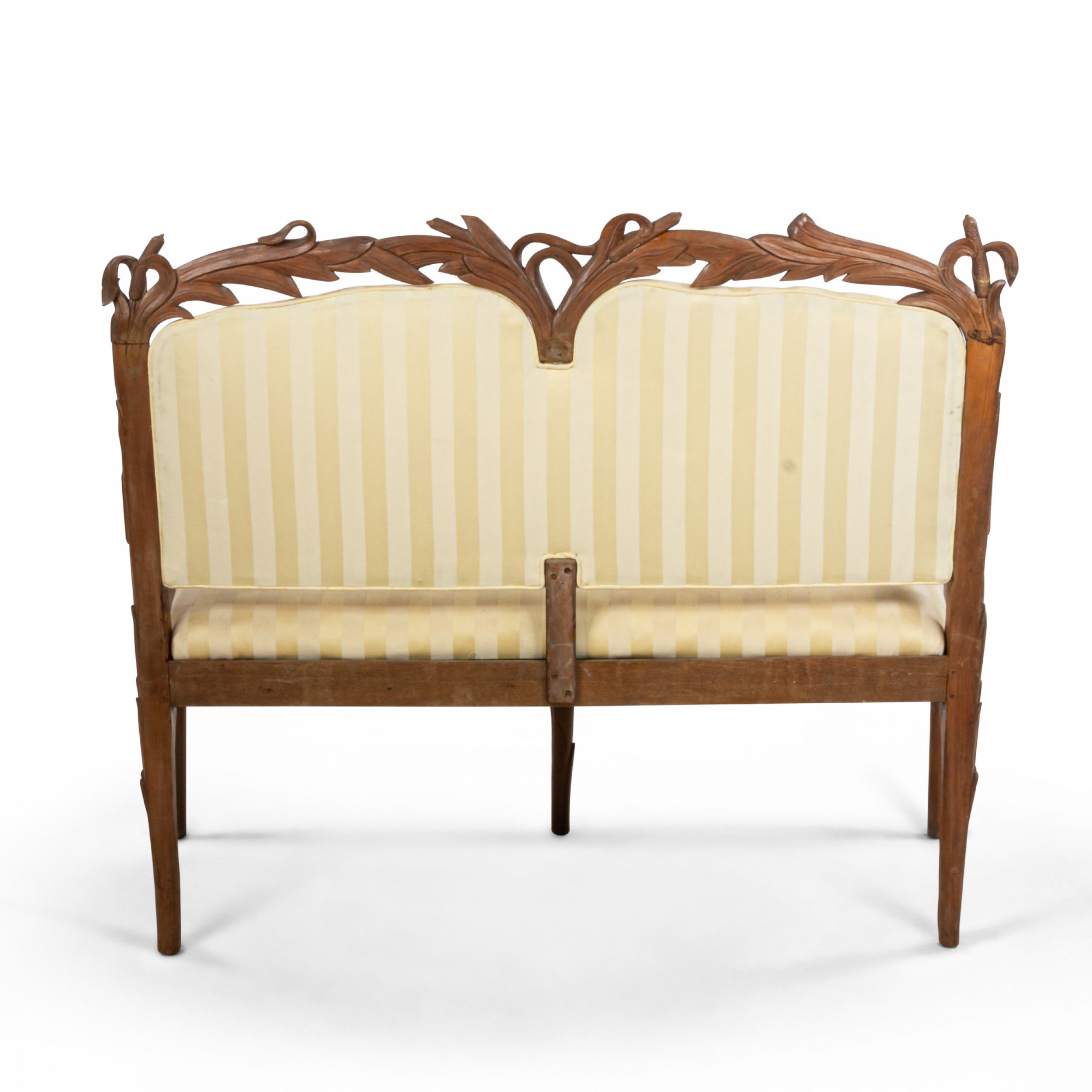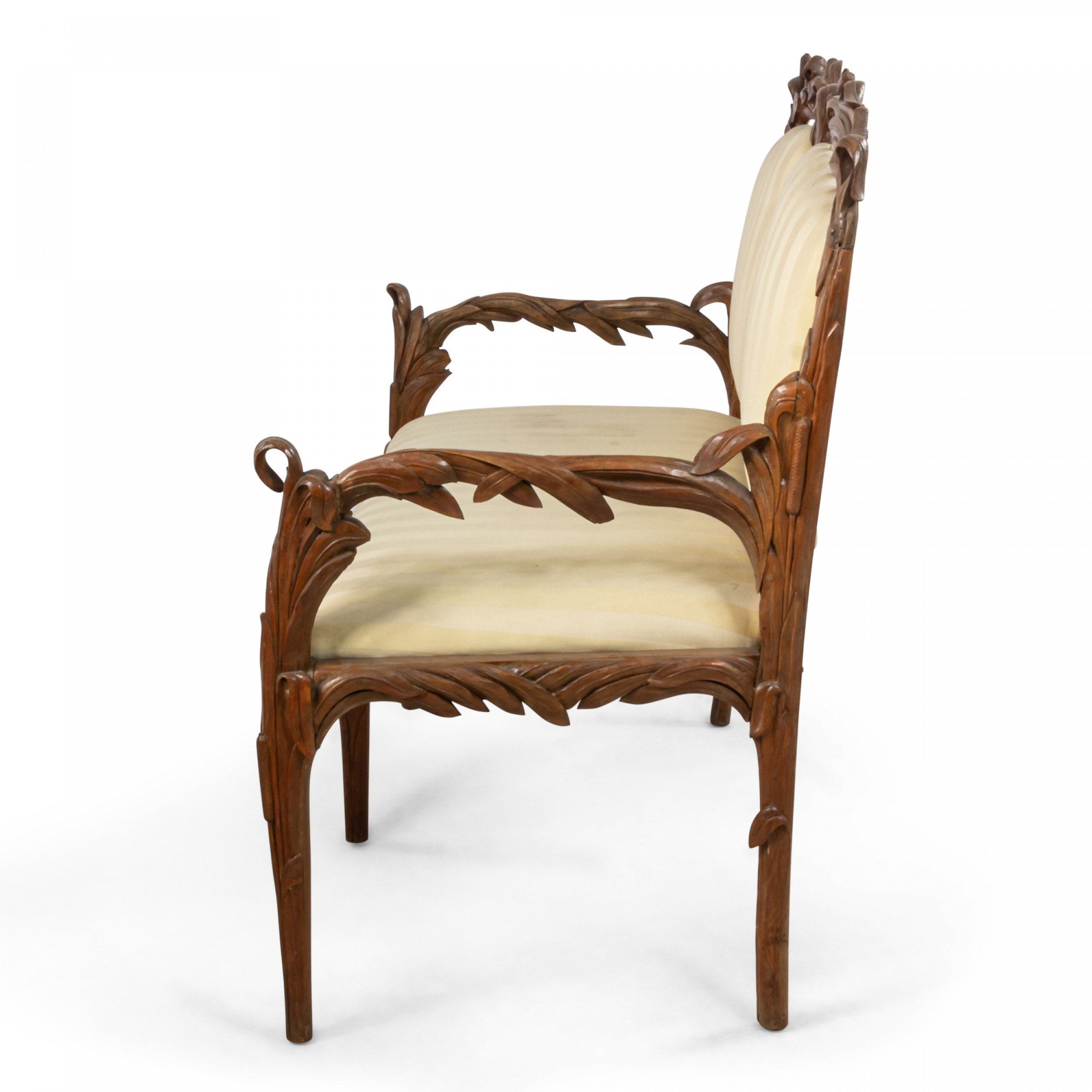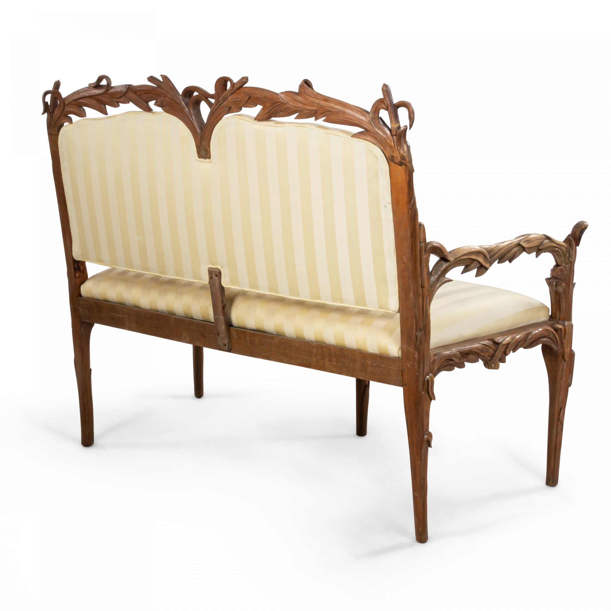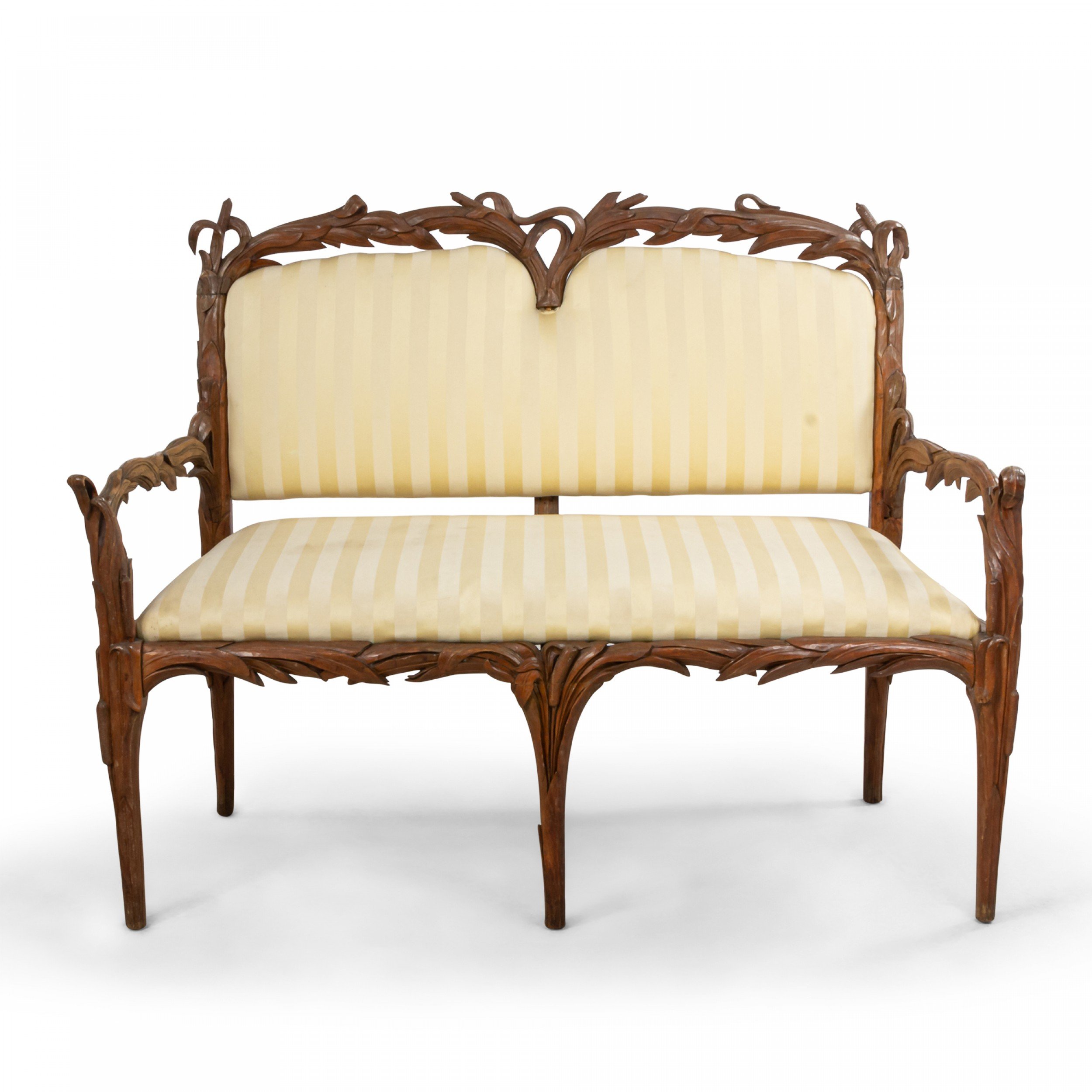 Rustic (Art Nouveau) Black Forest (19th Cen) walnut loveseat with floral carved frame and upholstered seat and back