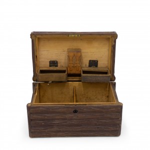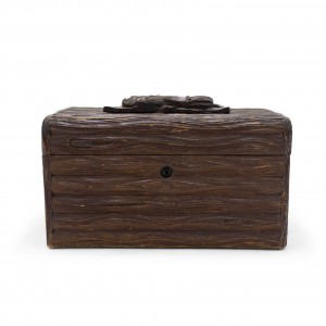 Rustic Black Forest (19th Century) walnut carved humidor box with faux wood design and smoking motif on top (interior of top has smoking accessories)
