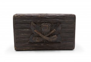 Rustic Black Forest (19th Century) walnut carved humidor box with faux wood design and smoking motif on top (interior of top has smoking accessories).