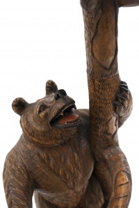 Rustic Black Forest-style (20th Century) walnut hatrack/umbrella stand with carved bears on base and 1 bear at top..
