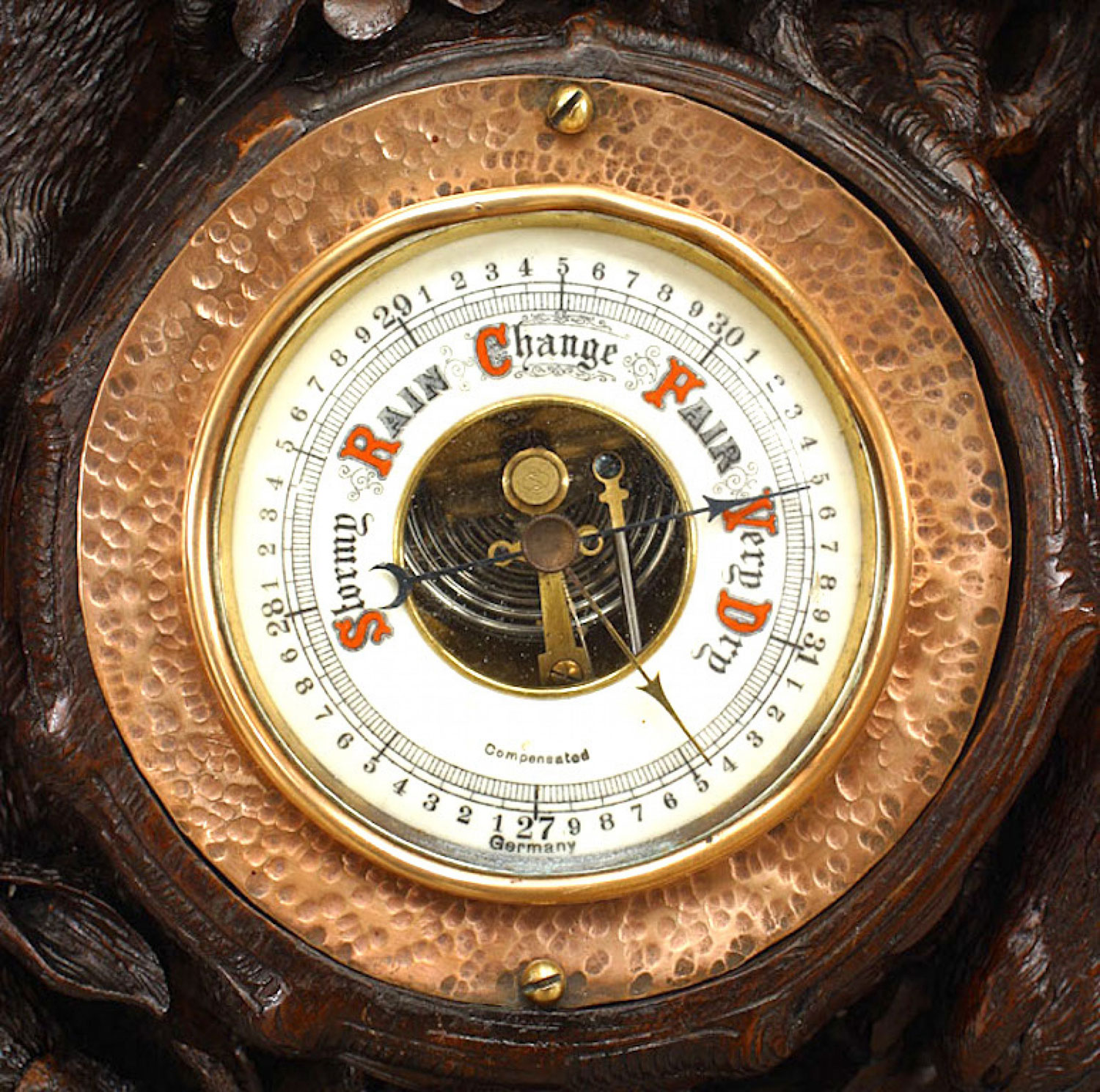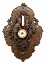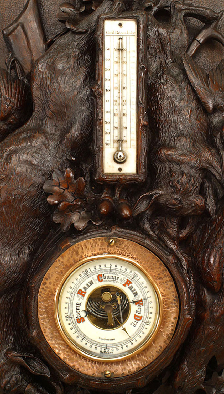 Rustic Black Forest (19th Century) walnut wall mounted thermometer/ barometer with strap-work cartouche hung with an elaborate carved hunting trophy.
